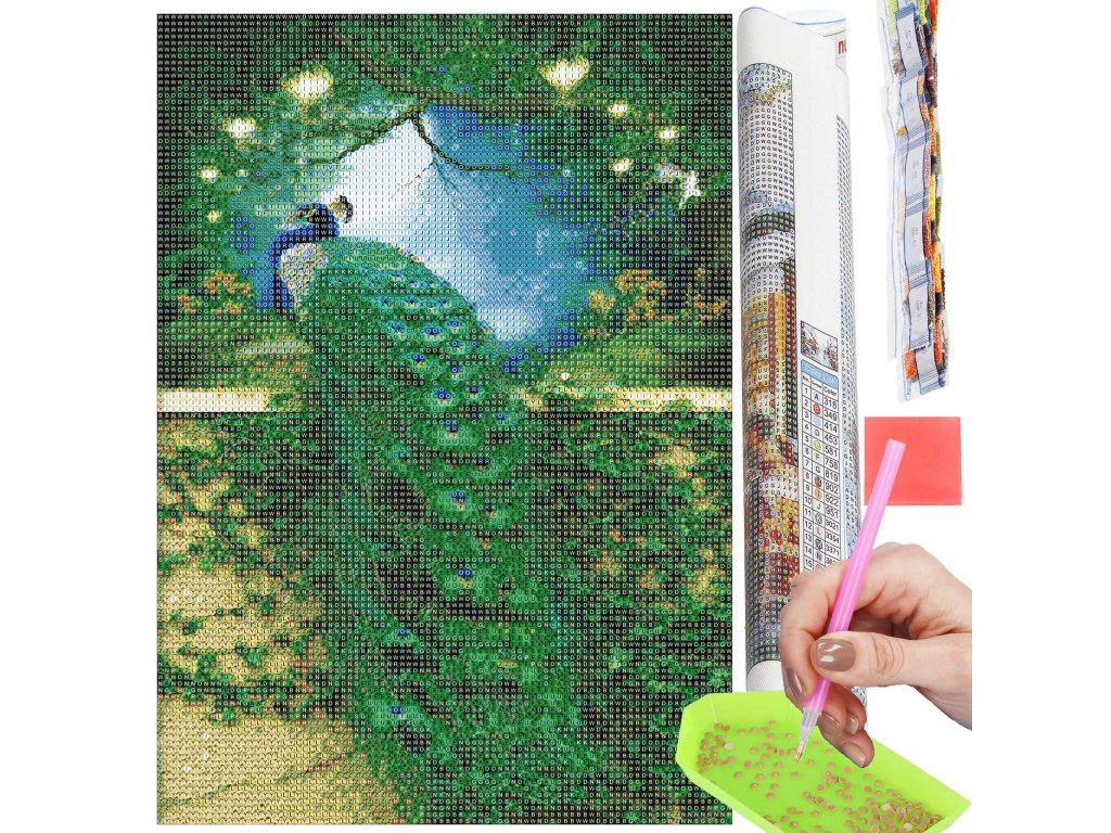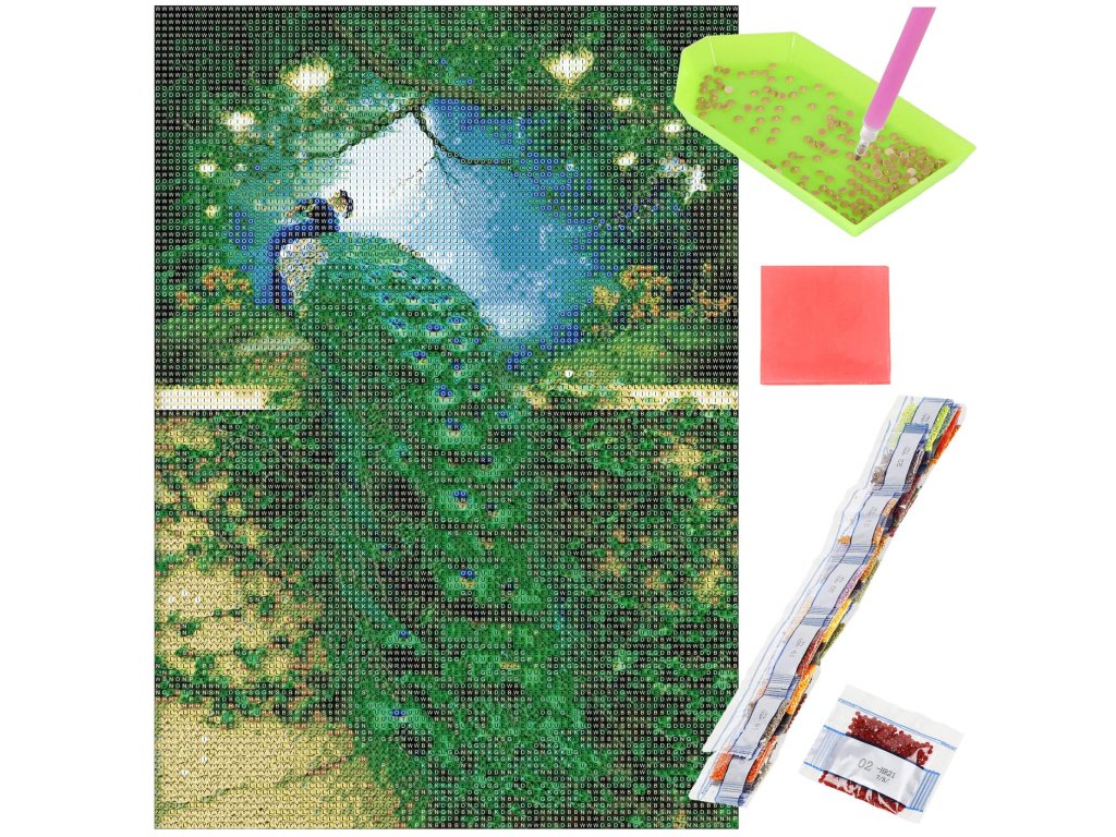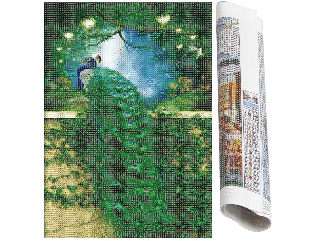 - 1x močno platno z natisnjeno sliko, ki prikazuje podobo pavana z indeksom, ki povezuje črke z barvami in barve s številkami, ki določajo barvo diamanta