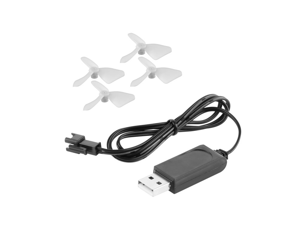 V kompletu: dron, USB kabel (za polnjenje), baterija drona, upravljalnik, rezervni propelerji, navodila za uporabo