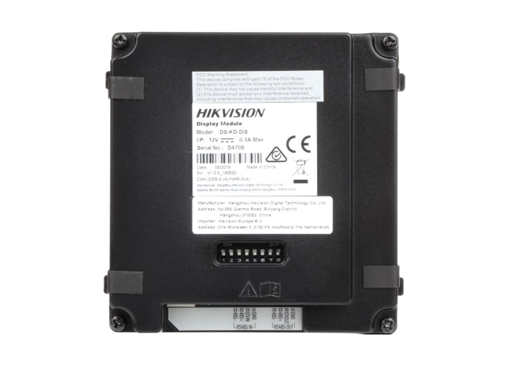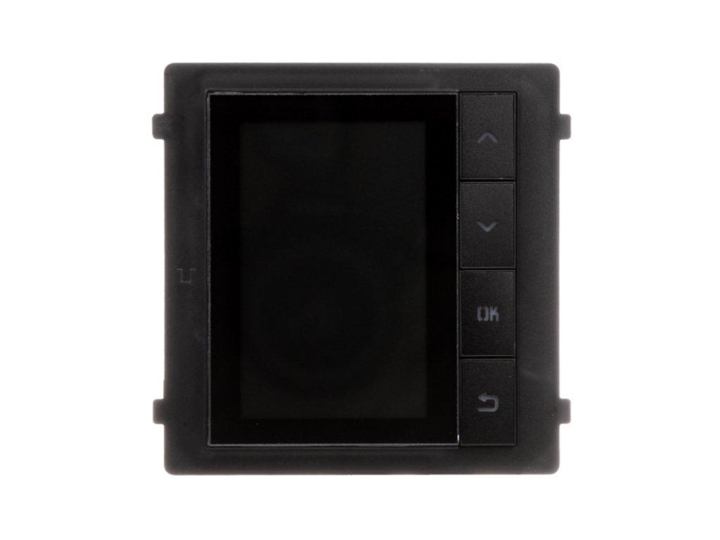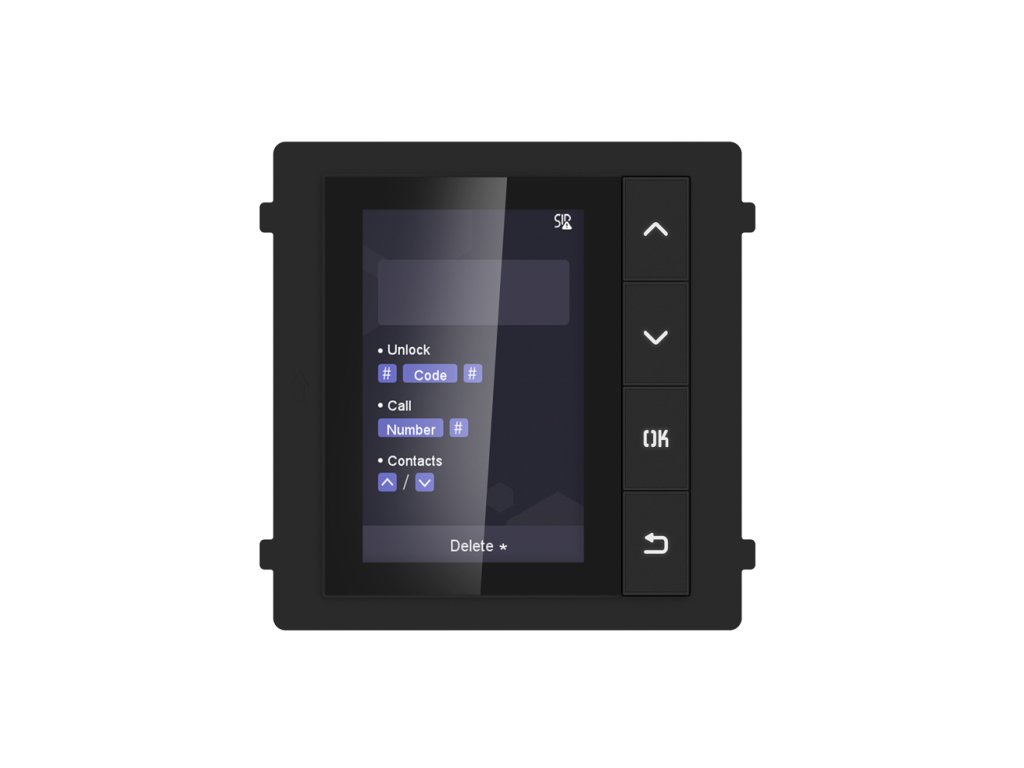 DS-KD-DIS znamka Hikvision je LCD modul zaslona, namenjen za IP video interkom. Naprava ima integriran zaslon 3,5" in 4 fizična gumba, ki omogočajo klicanje stanovanja s seznama stikov, predstavljenih na zaslonu. Naprava lahko prav tako služi kot zaslon za številke, ki jih kličemo s pomočjo tipkovnice DS-KD-KP. Celoten modul je zaprt v stilnem, robustnem ohišju, izdelanem v razredu odpornosti IP65.