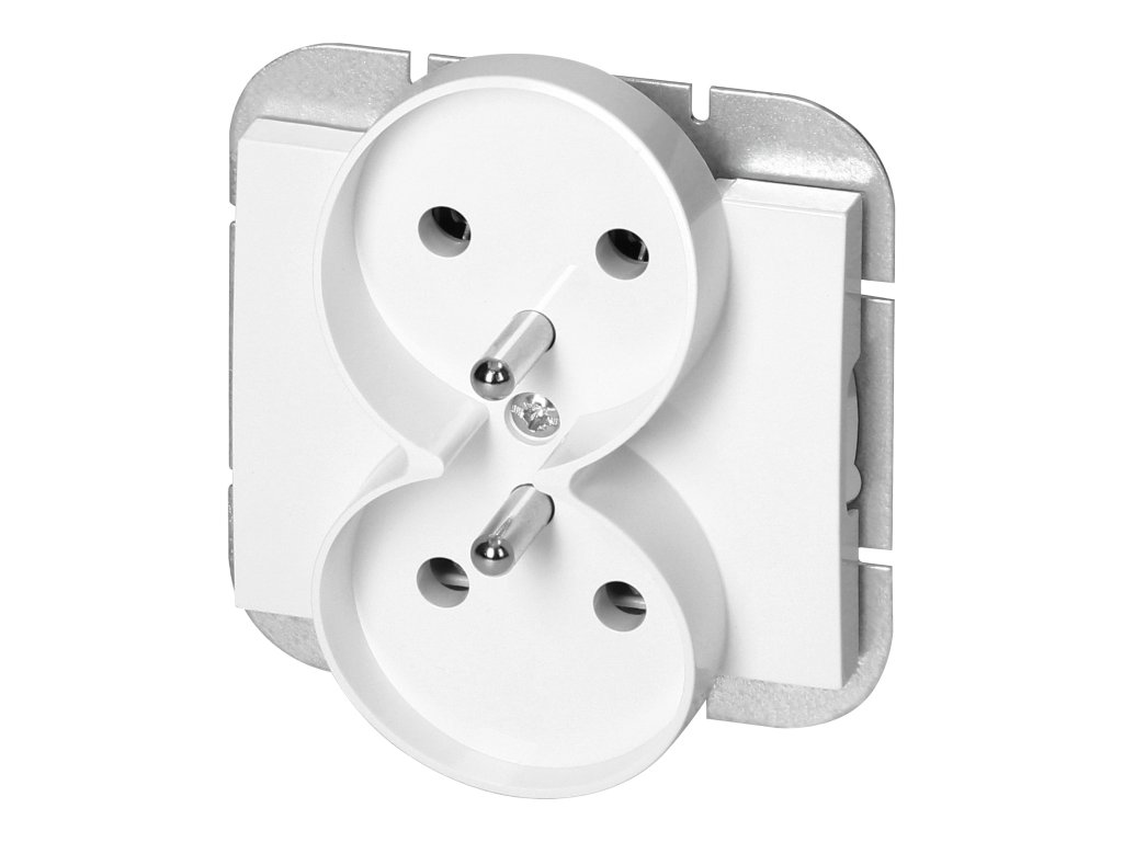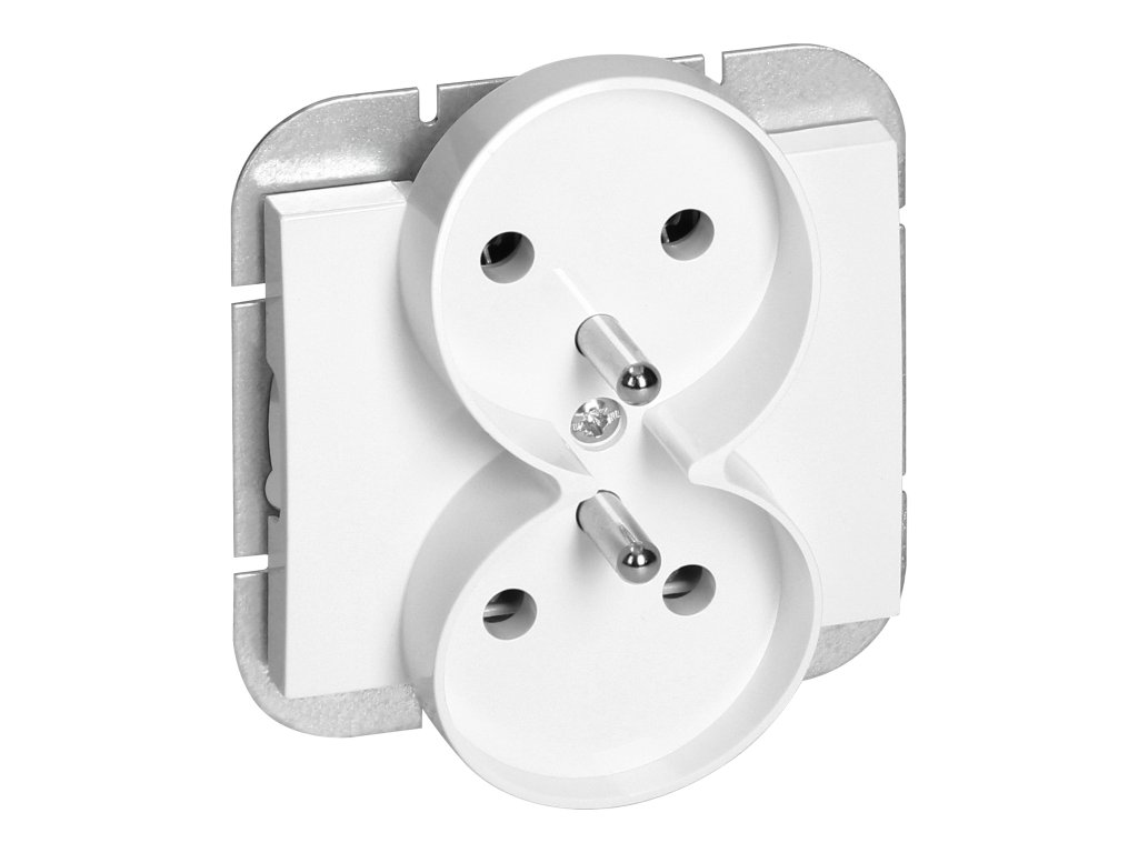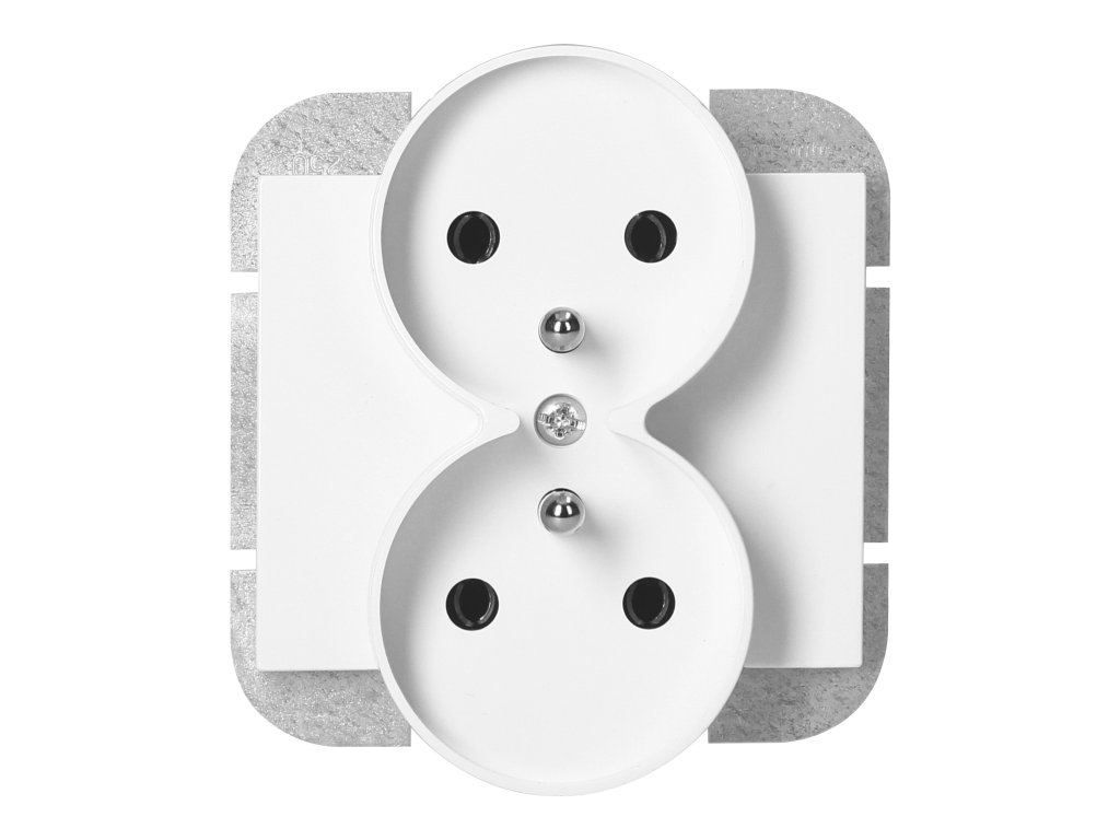 Modularna serija s sistemom okvirnih plošč. Serija sodobnih stikal in vtičnic, ki se harmonično zlijejo z originalnimi oblikovalskimi interierji. Sodobni mehanizem hitre povezave stikal (žice se povezujejo z neposrednim potiskanjem v telo) omogoča varno in zanesljivo namestitev in odstranitev žic. Vtičnice so opremljene s tradicionalnimi vijčnimi povezavami. Notranja zasnova terminalov zagotavlja zanesljivo povezavo žic od 0,75 mm? do 2,5 mm?. Močna in robustna rešetka montažne plošče ter posebni montažni elementi omogočajo stabilno in varno montažo v škatli.Dvojna francoska vtičnica, 2x2P+E. Namenjena za vgradnjo na plosko površino v sistemu okvirnih plošč. Uporablja se notranje (IP20).