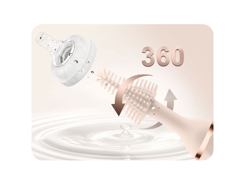 Električna krtača sprosti napetost pri pranju. Dve enostavno zamenljivi silikonski vrtljivi konici in posebna krtača za cevko zagotavljajo vsakdanjo higieno in omogočajo, da otroku postrežemo zdrav in varen obrok.