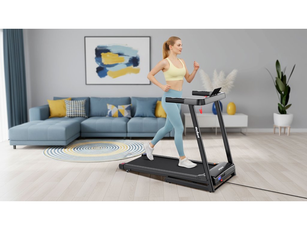 Vgrajeno držalo za telefon ali tablico vam omogoča, da med tekom uživate v najljubši glasbi ali seriji. To je popolna kombinacija zabave in aktivnosti – tako čas na tekalni stezi mine hitreje, motivacija pa raste z vsakim korakom.