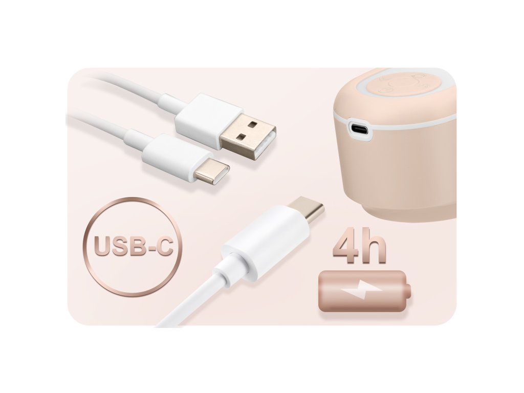 Črpalka za mleko Nukido deluje brezžično. Opremljena je z litij-ionsko baterijo, ki po polnjenju omogoča 4 ure uporabe, in se polni s priloženim polnilcem USB-C.