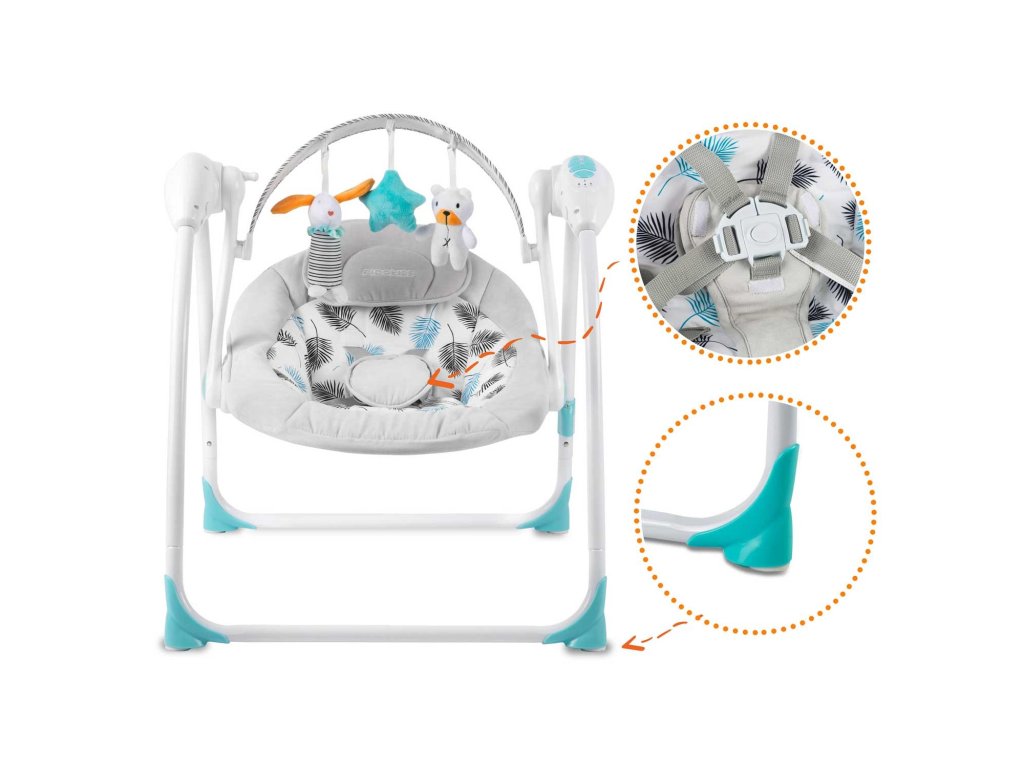 5 hitrosti guganja / časovnik / vgrajene melodije / tiho guganje / nastavitev naklona ležišča