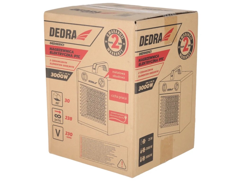 Električni grelec DED9931C 1 je naprava, namenjena uporabi v zaprtih prostorih. Uporablja se za ogrevanje stanovanjskih in komercialnih prostorov, kot so kleti, garaže, delavnice itd. Naprava je namenjena kot pomožni vir toplote, ne kot glavni vir toplote. Če je gumb temperature nastavljen na najnižjo raven, naprave ni mogoče uporabljati kot električni grelec brez funkcije ogrevanja. Keramični grelni element (PTC) zagotavlja toploto skoraj takoj po zagonu. Dvojna kovinska ohišja med delovanjem ne postanejo vroča. Naprava deluje tiho. Udoben ročaj za prenašanje.Toplota se prenese skoraj takoj.Ta izdelek je primeren samo za občasno uporabo ali za uporabo v dobro izoliranih prostorih.