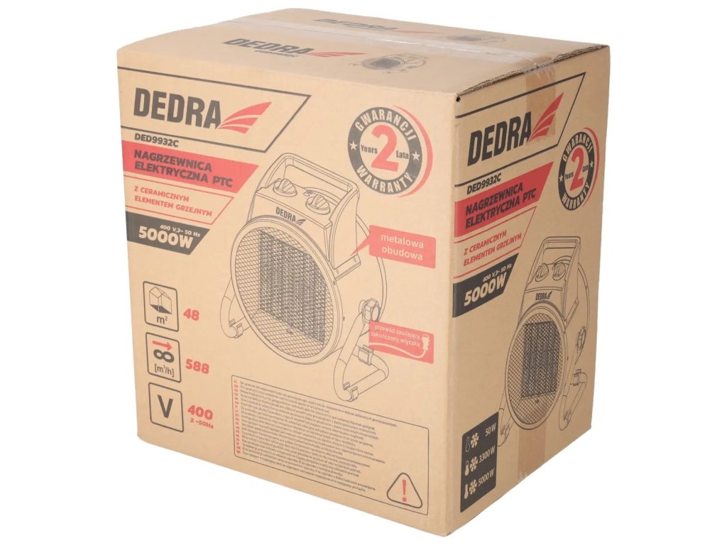 Električni grelec DED9931C je naprava namenjena uporabi v zaprtih prostorih. Uporablja se za ogrevanje prostorov in uporabnih površin, kot so kleti, garaže, delavnice itd. Naprava je namenjena uporabi kot pomožni vir toplote, ne kot glavni vir toplote. Če je gumb za temperaturo nastavljen na minimum, naprave ni mogoče uporabljati kot ventilator brez funkcije ogrevanja. Zaradi keramičnega grelnega telesa (PT C) je toplota občutna skoraj takoj po vklopu. Kovinsko ohišje. Udoben ročaj za prenašanje.Ta izdelek je primeren le za občasno uporabo ali za uporabo v dobro izoliranih prostorih.