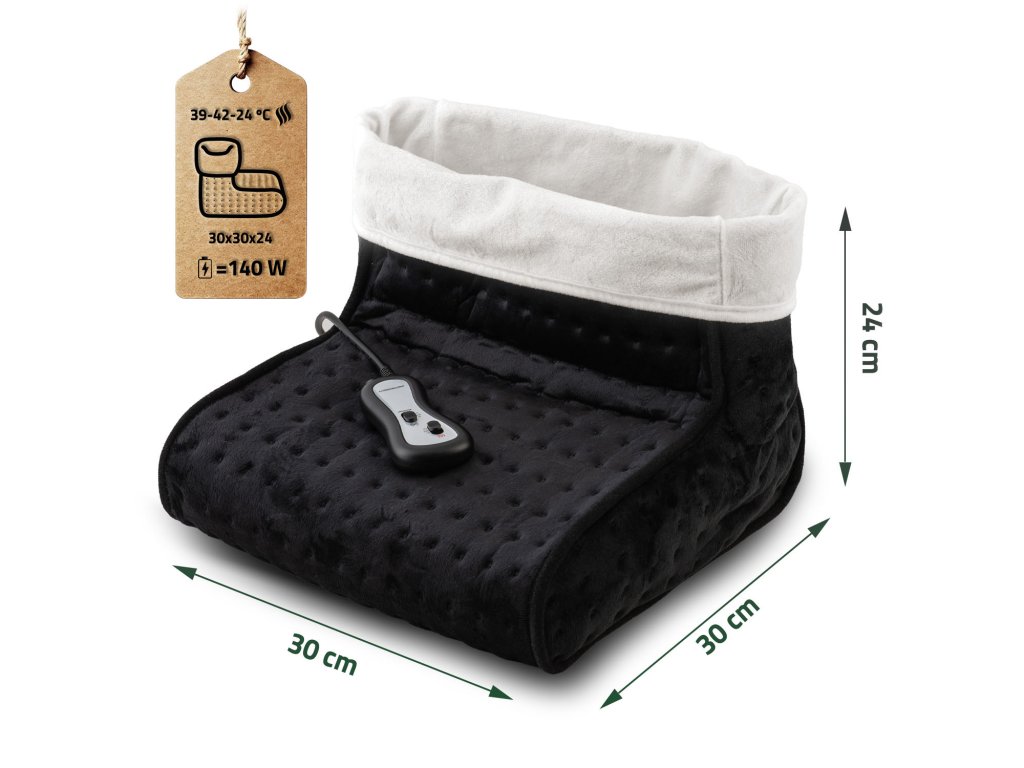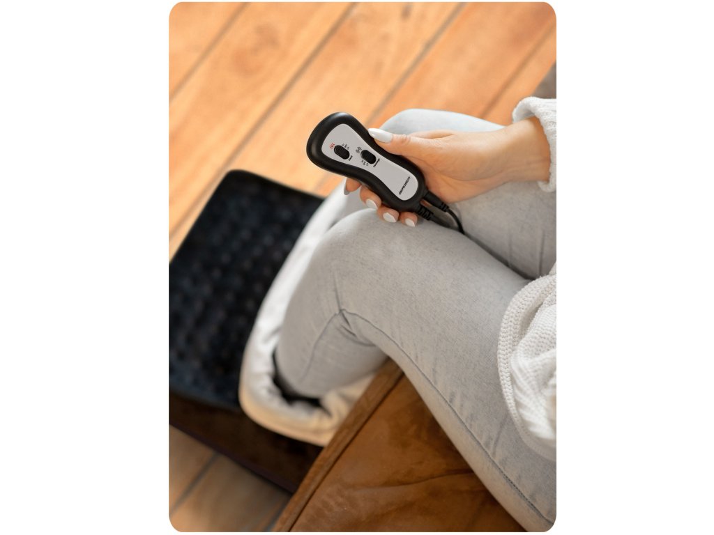Grelnik za noge s močjo 140 W ima 2 ravni regulacije, ki omogočajo nastavitev temperature po vaših potrebah. Gosta tkanina zagotavlja enakomerno razporeditev toplote, učinkovito preprečuje izgubo, zaradi česar noge ostanejo prijetno tople.