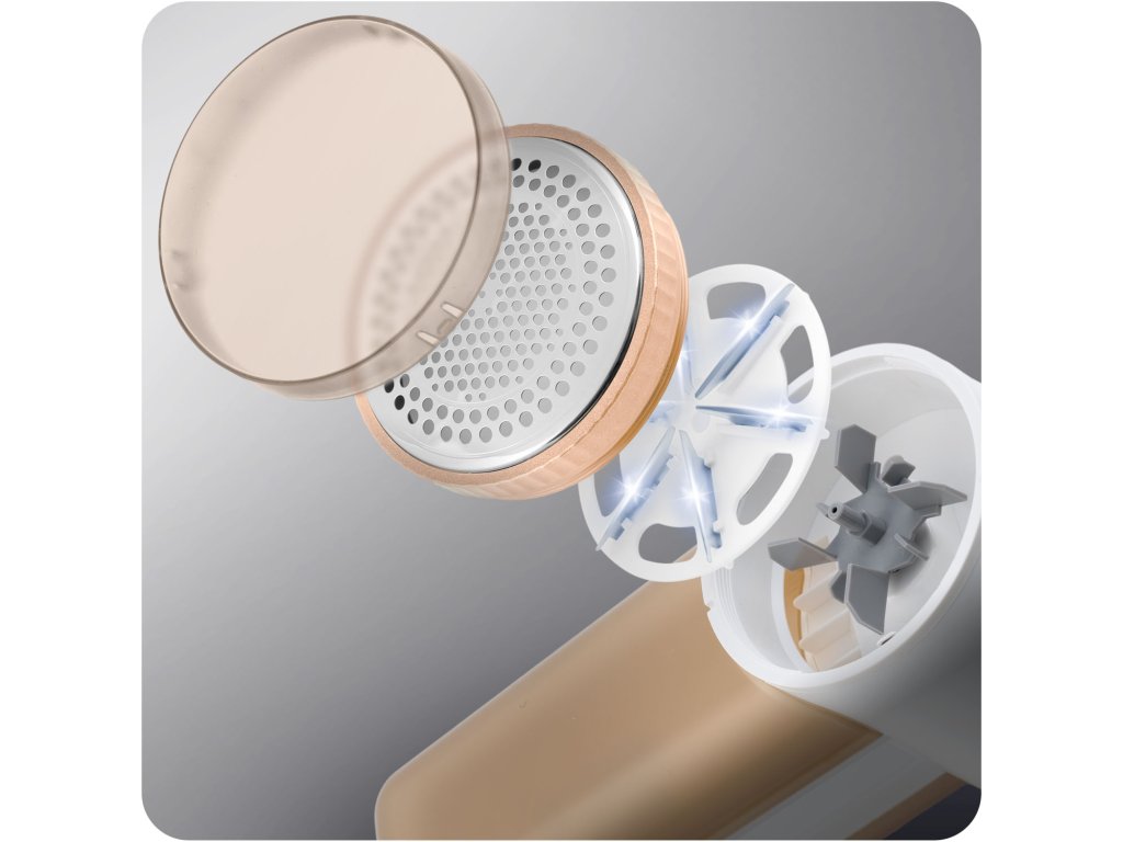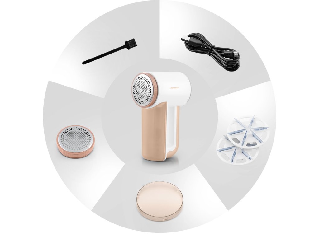 - 6 rezil iz nerjavečega jekla zagotavlja natančno in učinkovito odstranjevanje kepic, muck, izstopajočih niti in nitk iz tkanin.