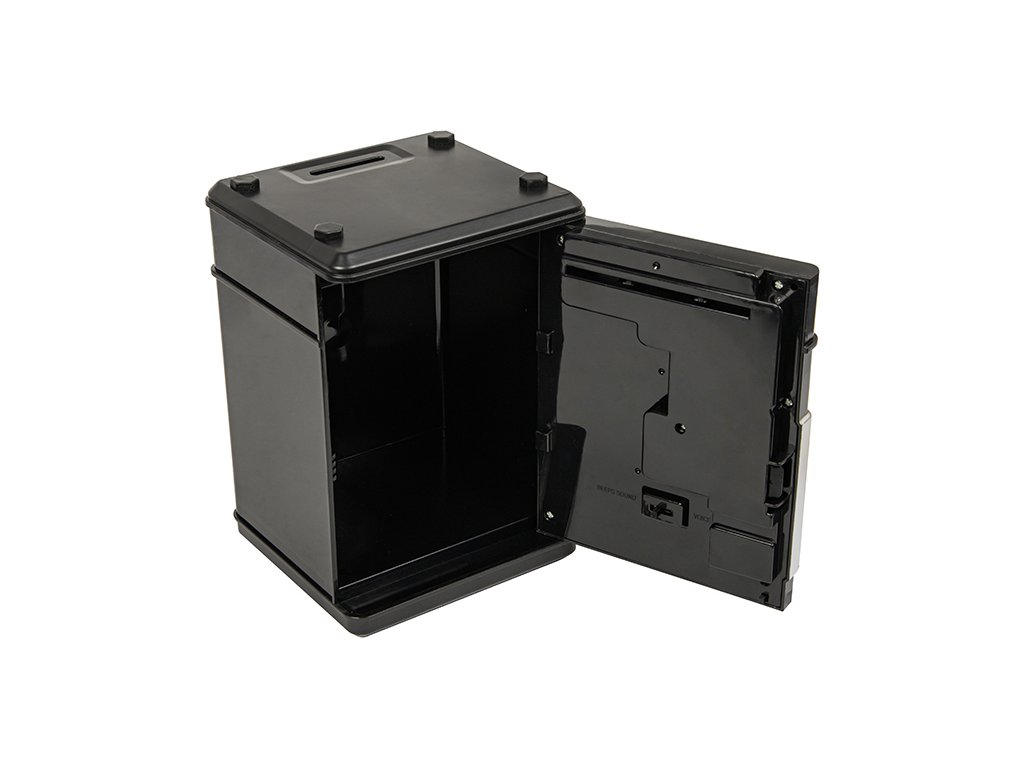 - Kompaktna zasnova: Eleganten črn površina in kompaktne oblike omogočajo enostavno skrivanje sef, kar povečuje varnost.