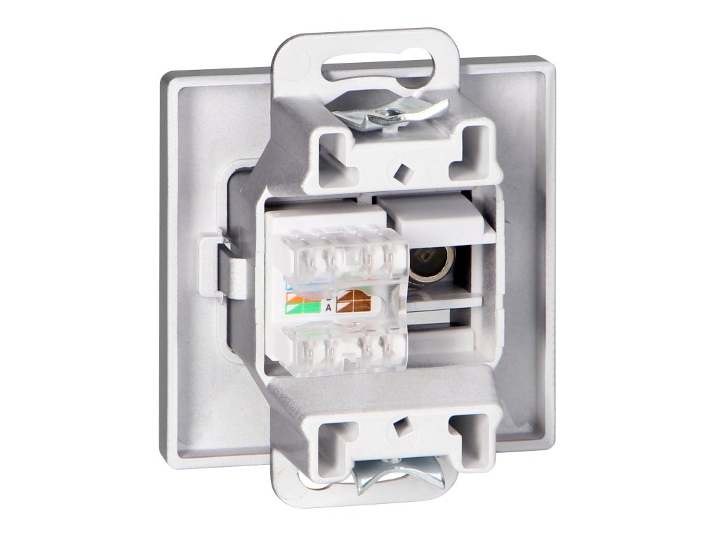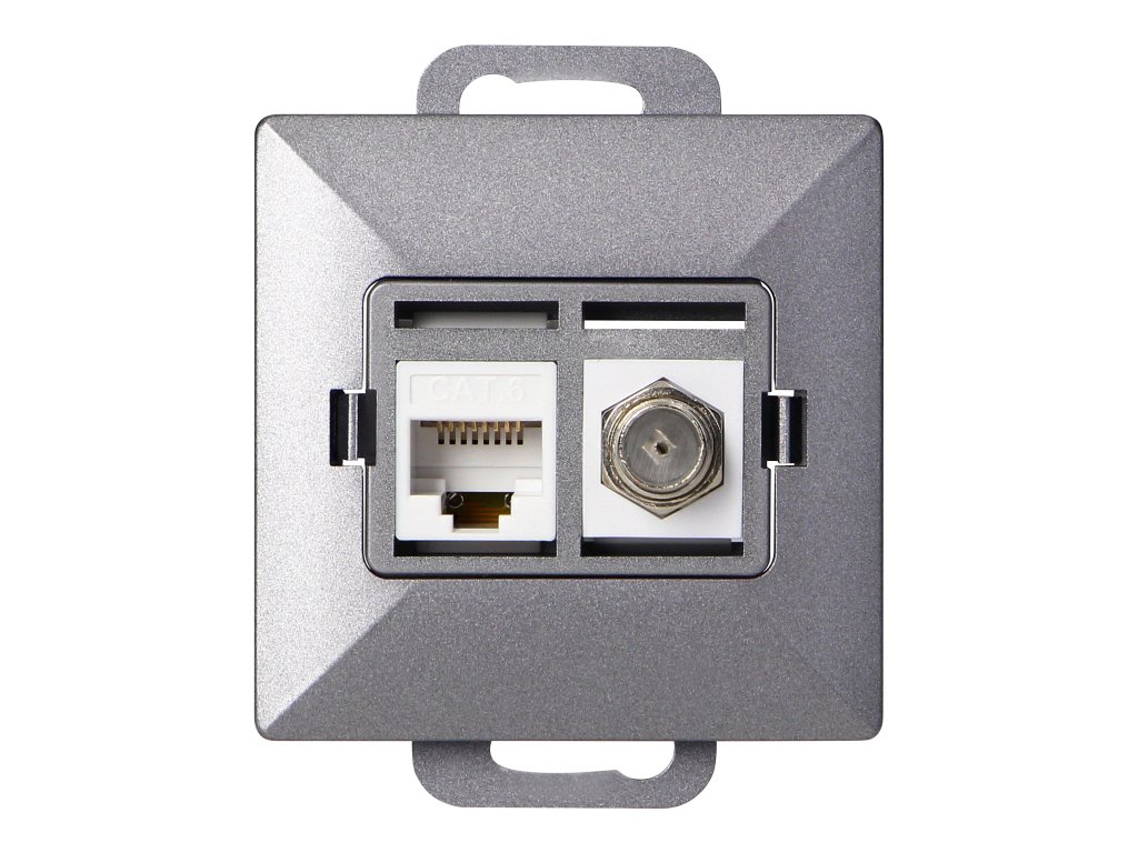 Modularna serija s simetričnim sistemom okvirnih plošč (za 1-, 2-, 3-, 4-, 5-modularne) omogoča montažo izdelka v vodoravnem in navpičnem položaju. Sodobni mehanizem hitrega povezovanja (žice se povežejo z neposrednim potiskom v ohišje) zagotavlja varno in zanesljivo namestitev ter odstranitev žic. Vtičnice so opremljene s tradicionalnimi vijačnimi povezavami. Notranja zasnova priključkov zagotavlja varno povezavo žic od 0,75 mm? do 2,5 mm?. Močna in trpežna mreža montažne plošče ter visokokakovostni elementi, ki se sami vračajo, omogočajo stabilno in zanesljivo montažo v škatli. Posebni vzmetni elementi olajšajo pritrditev okvirja v ohišje.Komplet vtičnic: enojna vtičnica za anteno, tipa F. Omogoča priključitev enega kabla s priključkom tipa F. Enojna računalniška vtičnica RJ45, neoklopljena Cat6. Prilagojena za montažo na plosko. Uporabljati jo je treba v zaprtih prostorih (IP20).