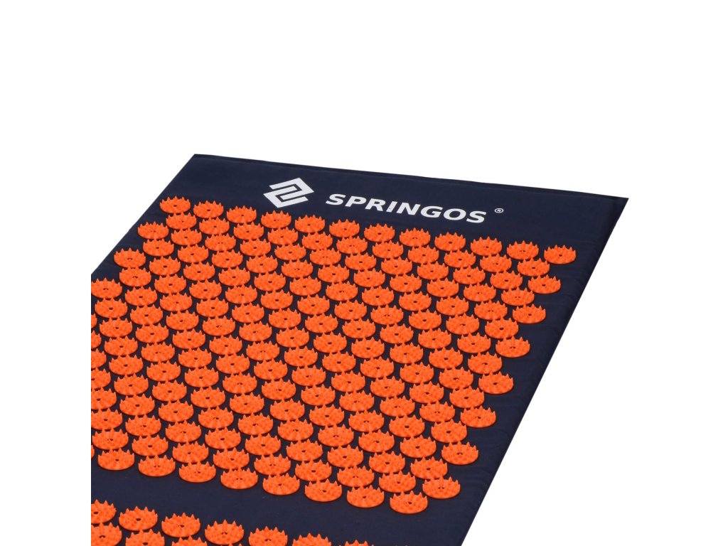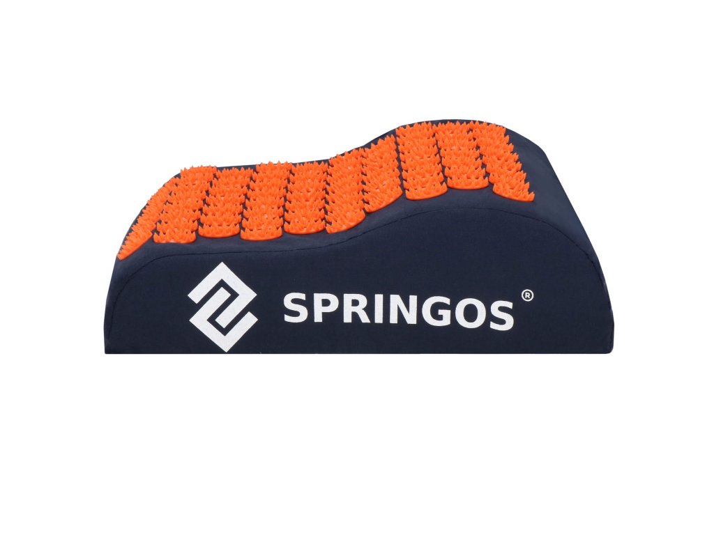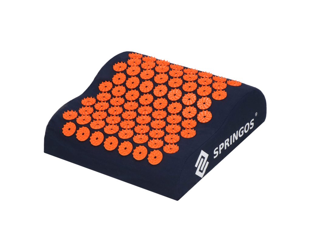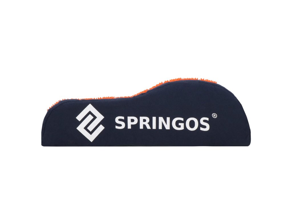 - Bombažne prevleke blazine in vzglavnika so narejene iz materiala v temno modri barvi, našiti diski z bodicami v oranžni barvi. Na prevlekah je natisnjen bel logotip Springos, + na blazini prišit stranski našitek z logotipom.
