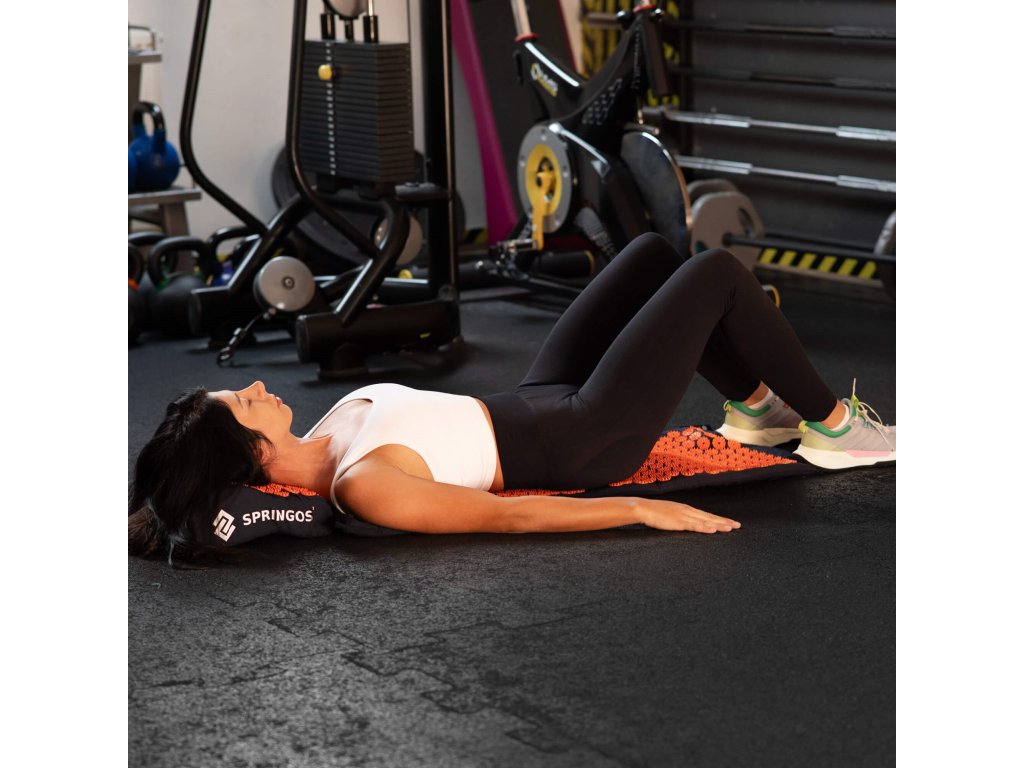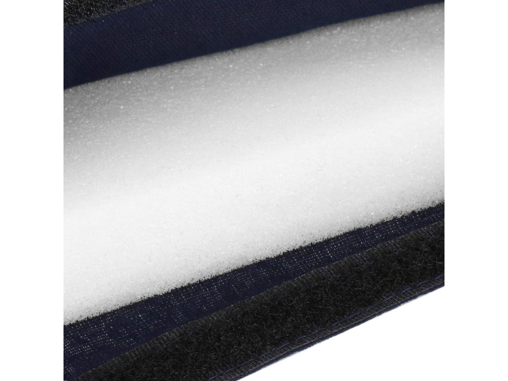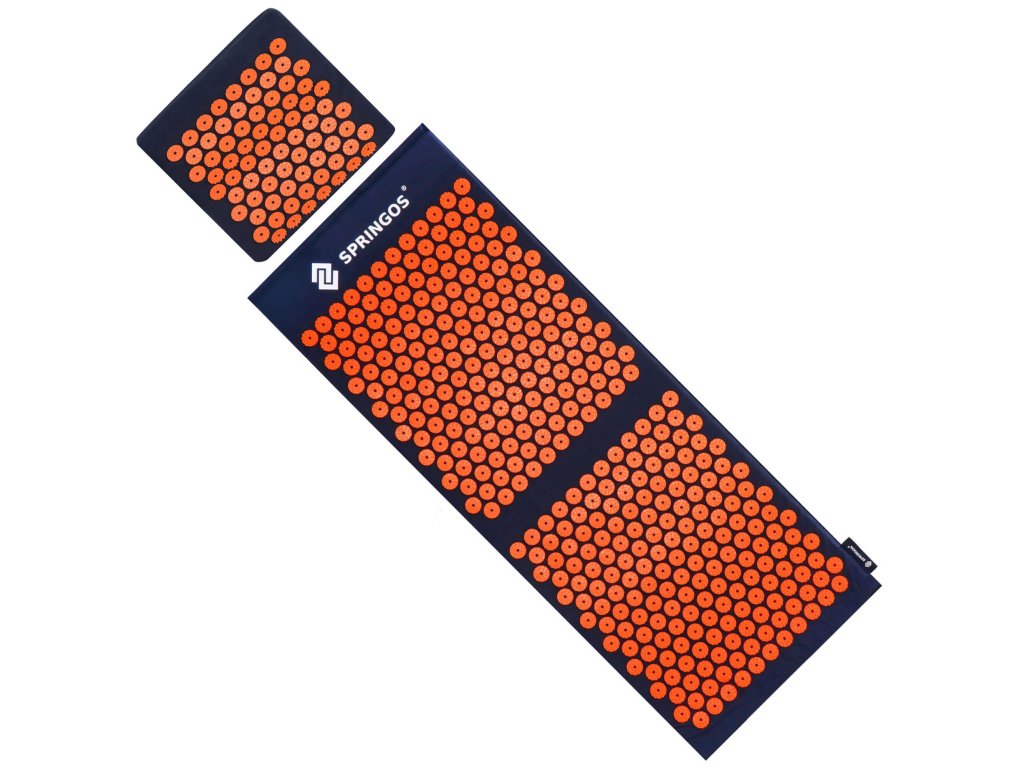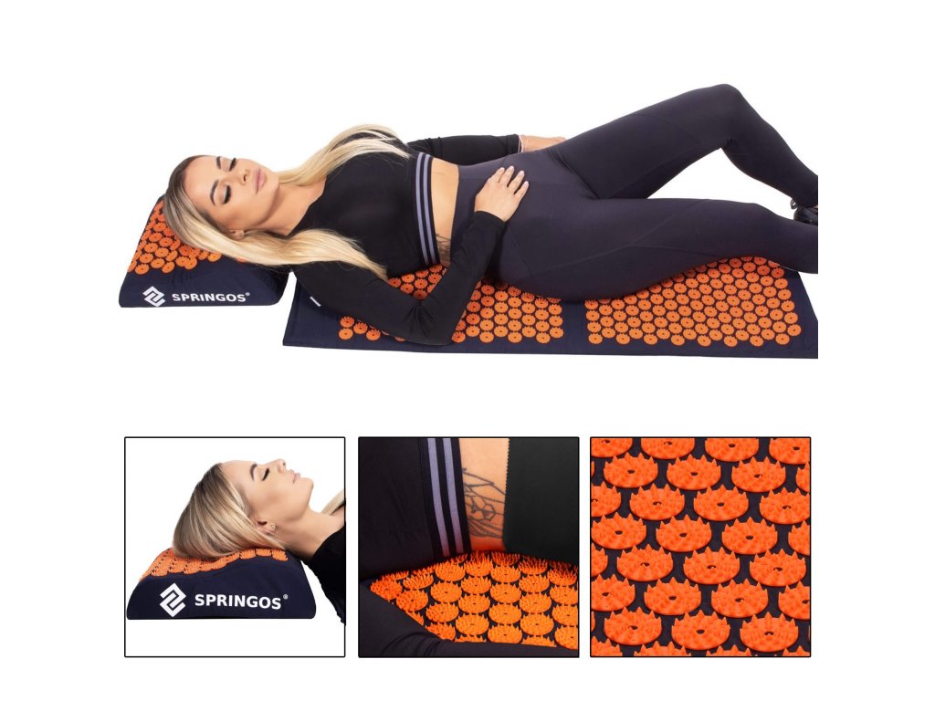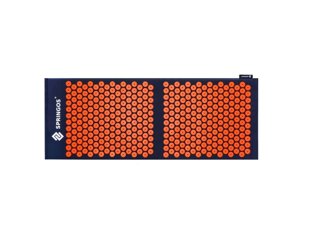 - Bombažne prevleke blazine in vzglavnika so narejene iz materiala v temno modri barvi, našiti diski z bodicami v oranžni barvi. Na prevlekah je natisnjen bel logotip Springos, + na blazini prišit stranski našitek z logotipom.