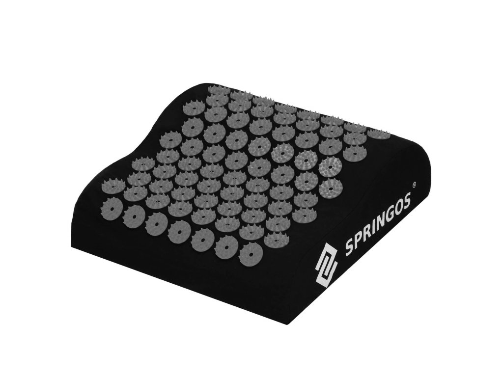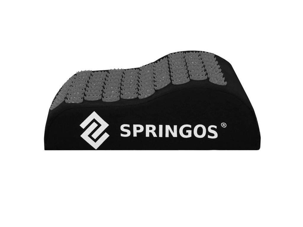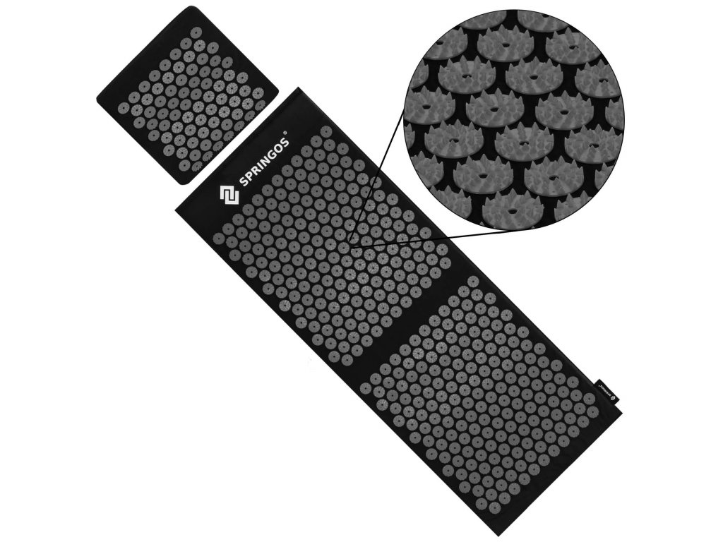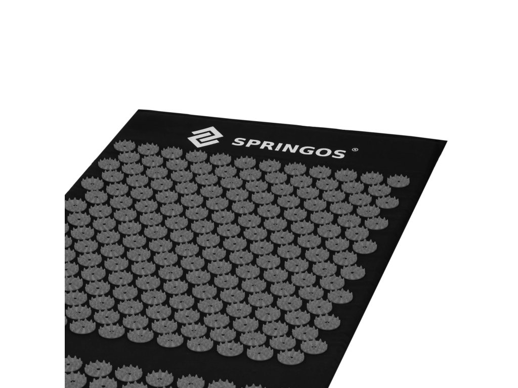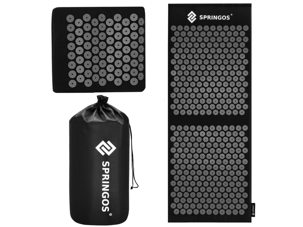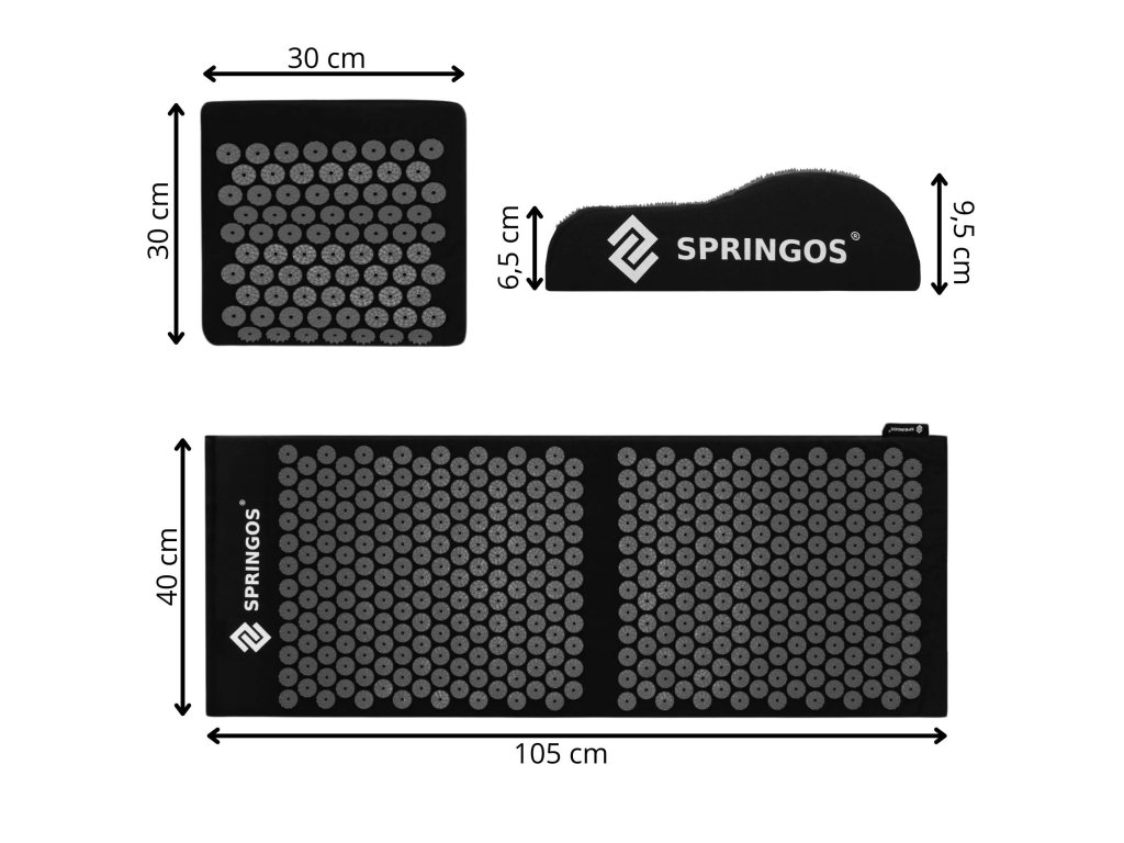 - Bombažne prevleke za podlogo in blazino so narejene iz črnega materiala, prišiti diski s črnimi konicami. Na prevlekah je natisnjen bel logotip Springos, + na podlogi je prišita stranska etiketa z logotipom.