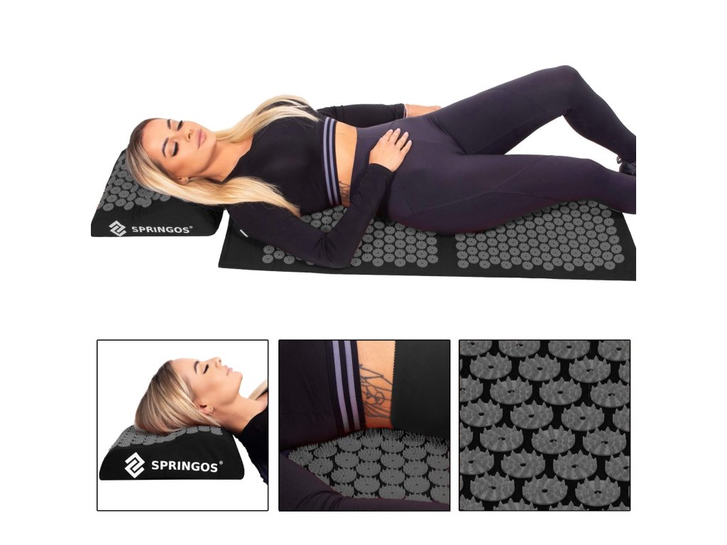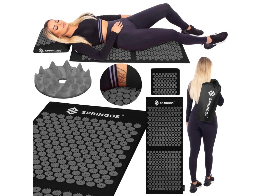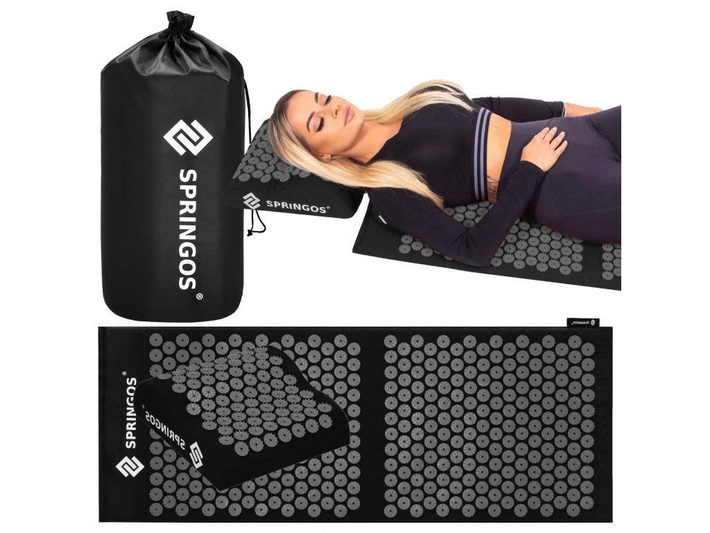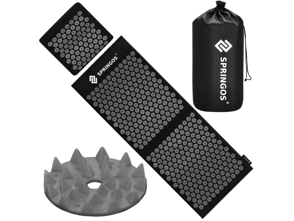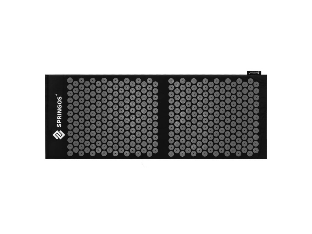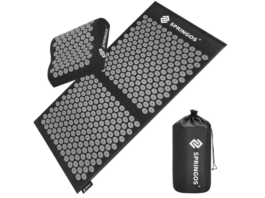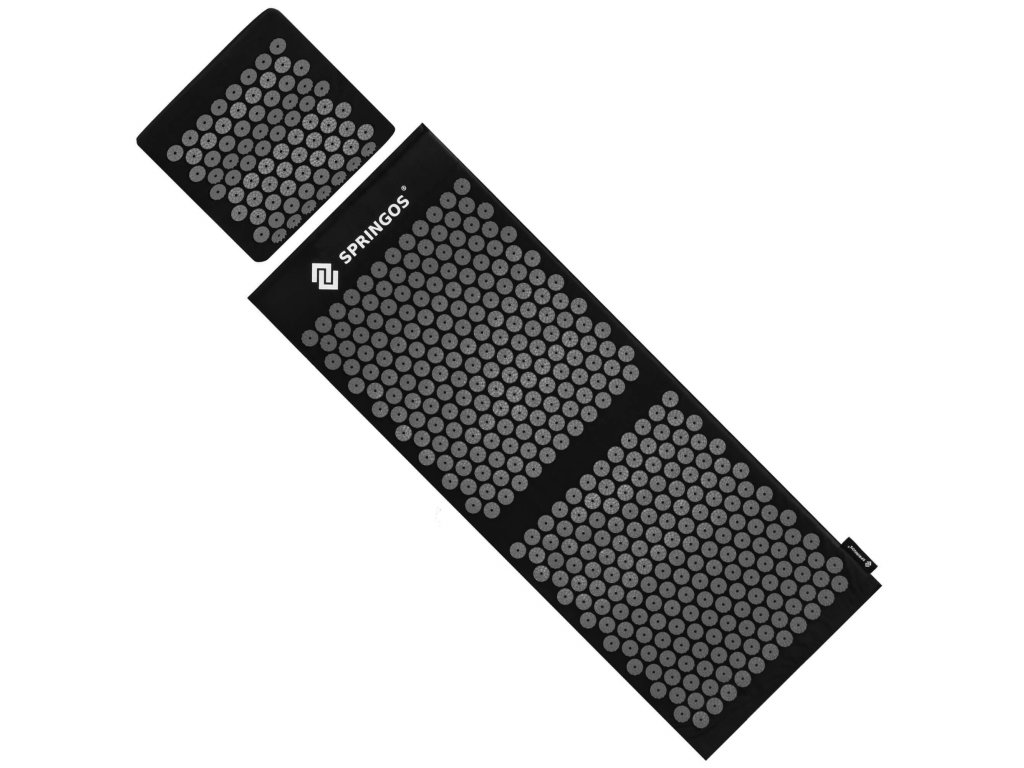 - Bombažne prevleke za podlogo in blazino so narejene iz črnega materiala, prišiti diski s črnimi konicami. Na prevlekah je natisnjen bel logotip Springos, + na podlogi je prišita stranska etiketa z logotipom.