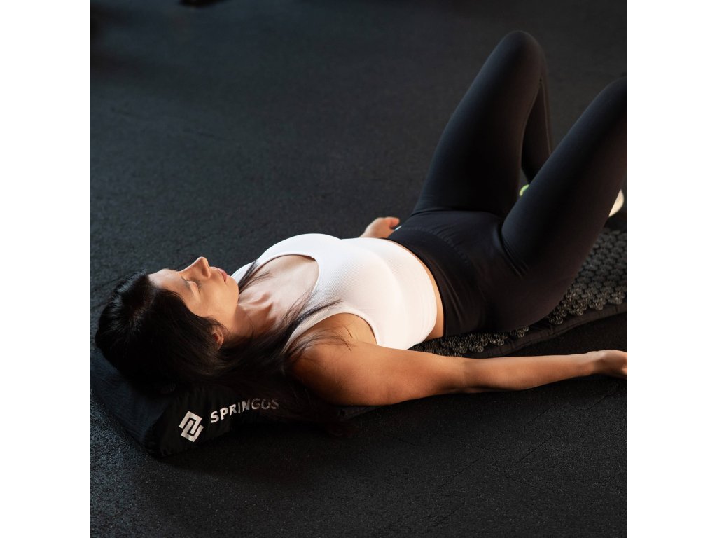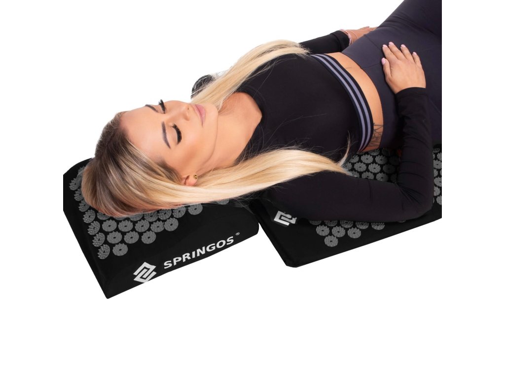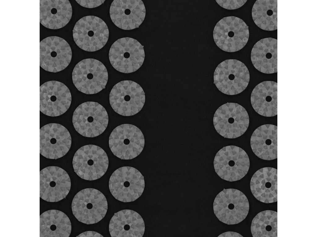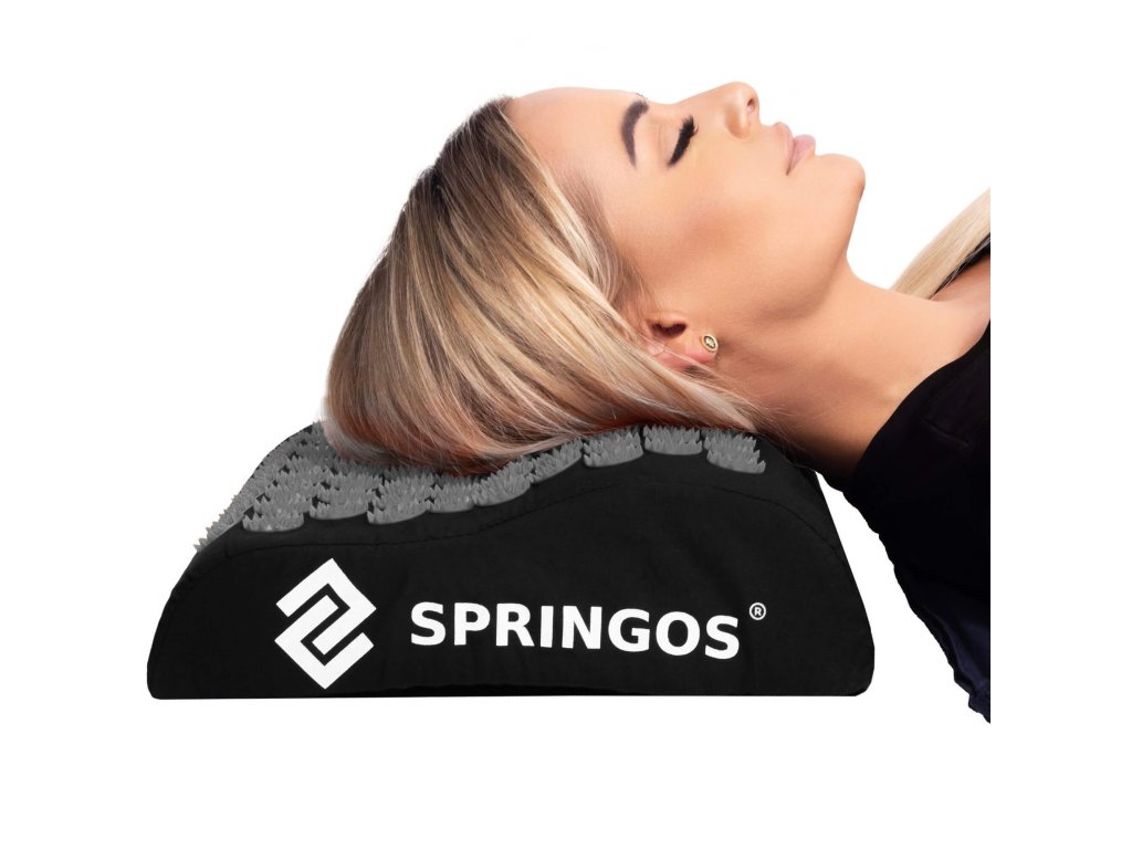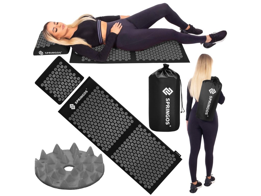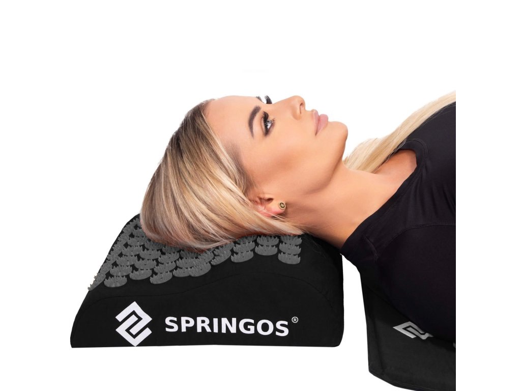 - Bombažne prevleke za podlogo in blazino so narejene iz črnega materiala, prišiti diski s črnimi konicami. Na prevlekah je natisnjen bel logotip Springos, + na podlogi je prišita stranska etiketa z logotipom.