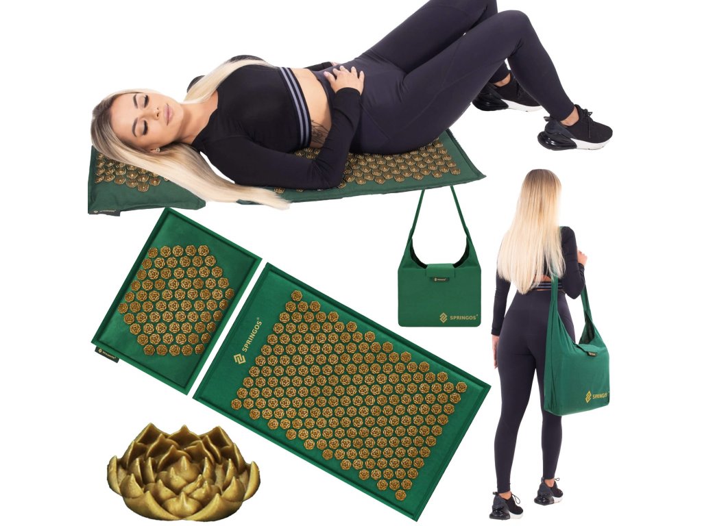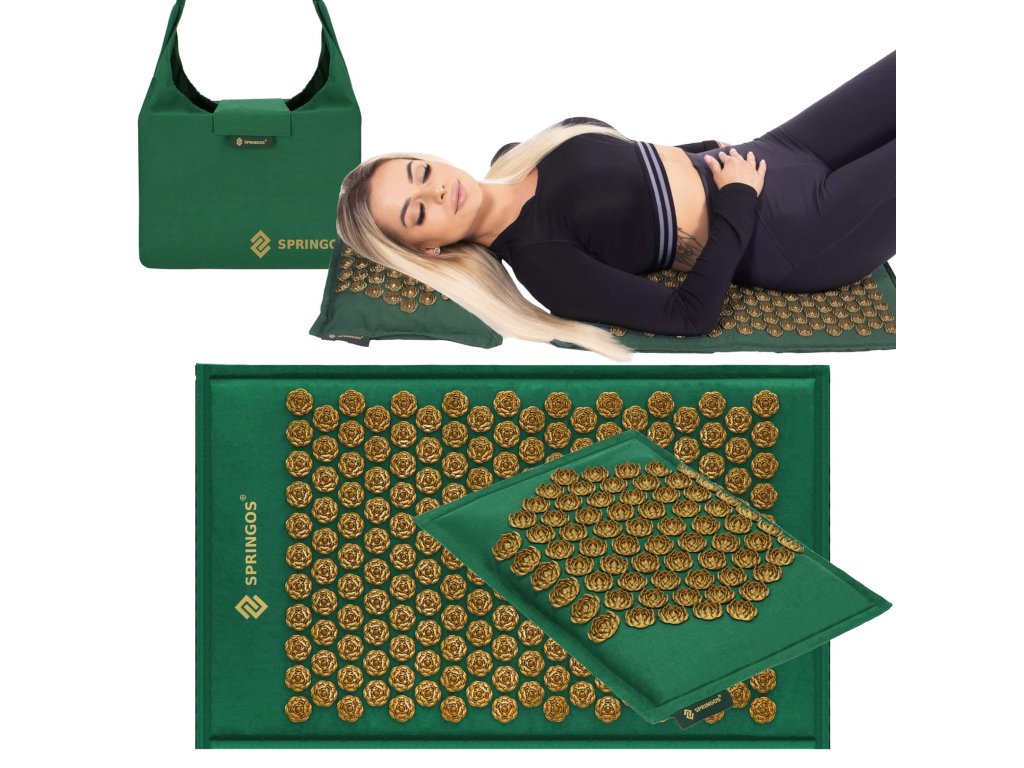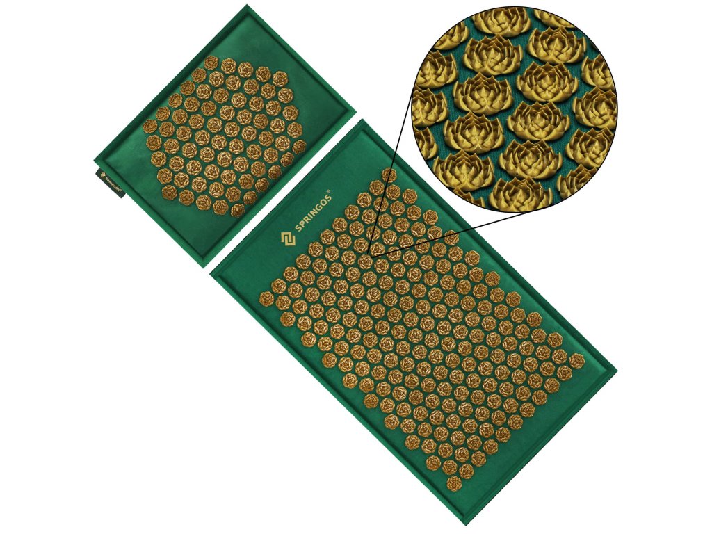 - Lanene prevleke podloge in vzglavnika so narejene iz materiala v temno zeleni barvi, prišite rozete s konicami v barvi matiranega zlata. Na prevlekah so prišiti stranski trakovi z logotipom Springos, + na podlogi je odtisek logotipa (barva logotipa bež).