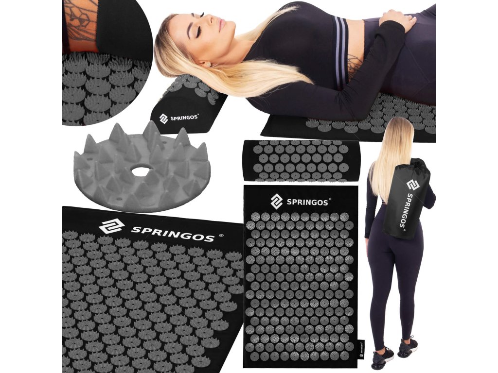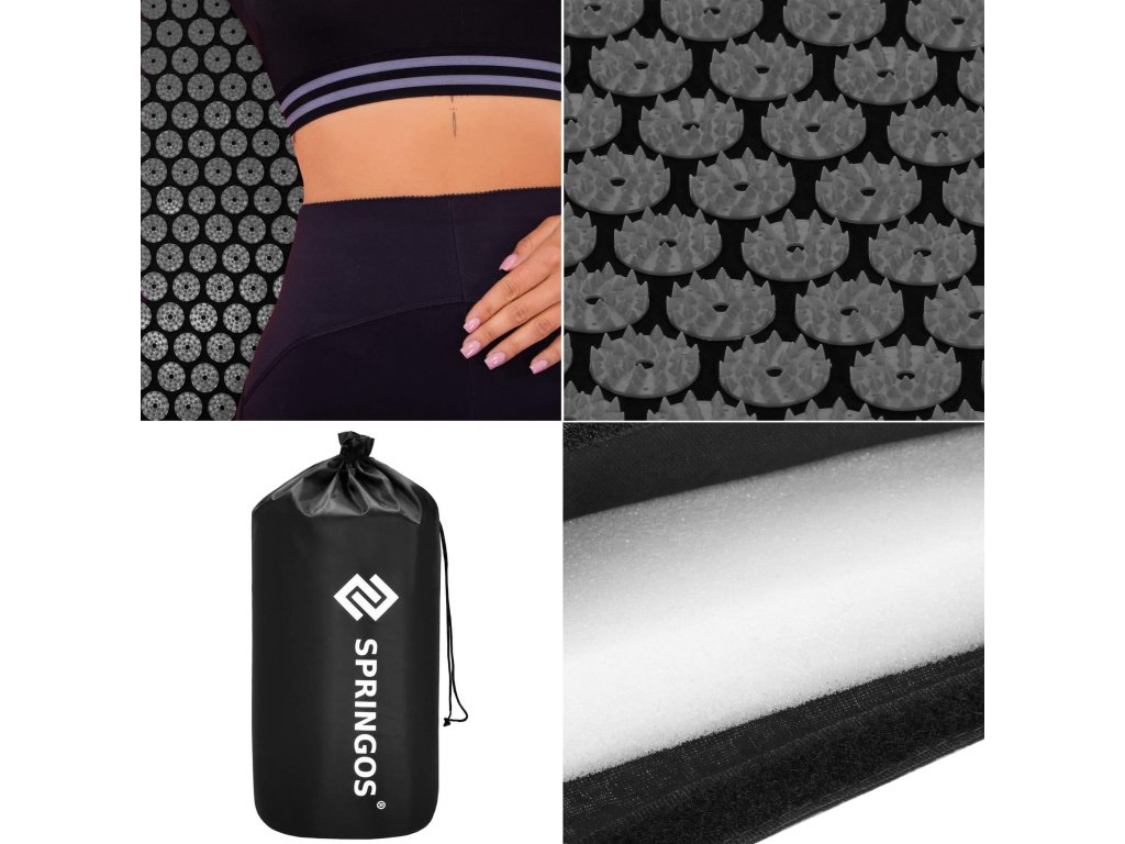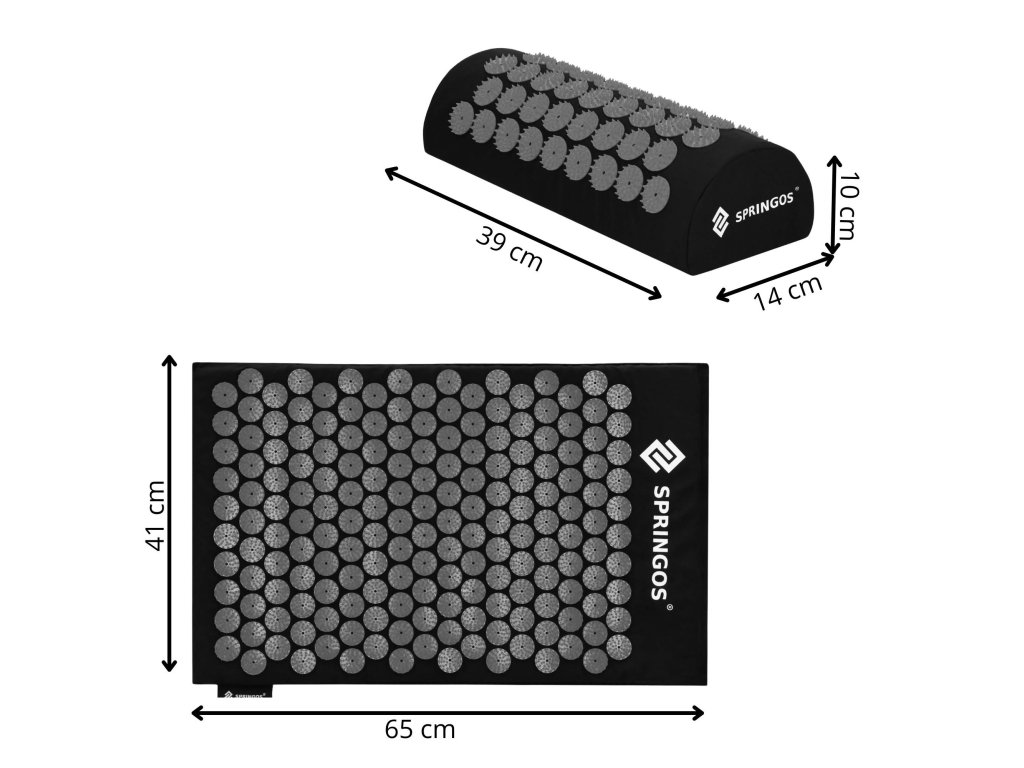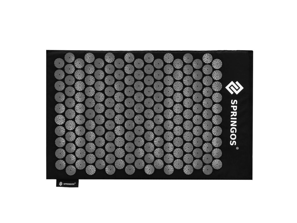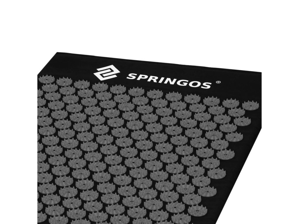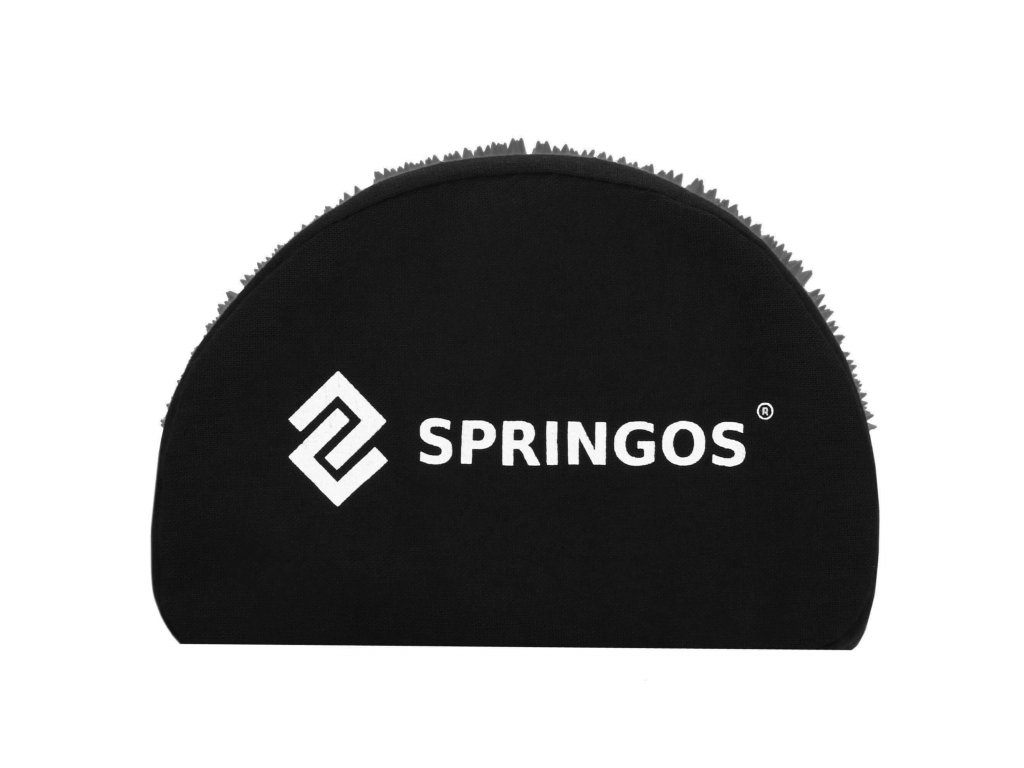 - Bombažne prevleke za podlogo in blazino so narejene iz materiala v črni barvi, našiti diski s konicami v črni barvi. Na prevlekah je tiskani bel logotip Springos, + na podlogi prišita bočna oznaka z logotipom.