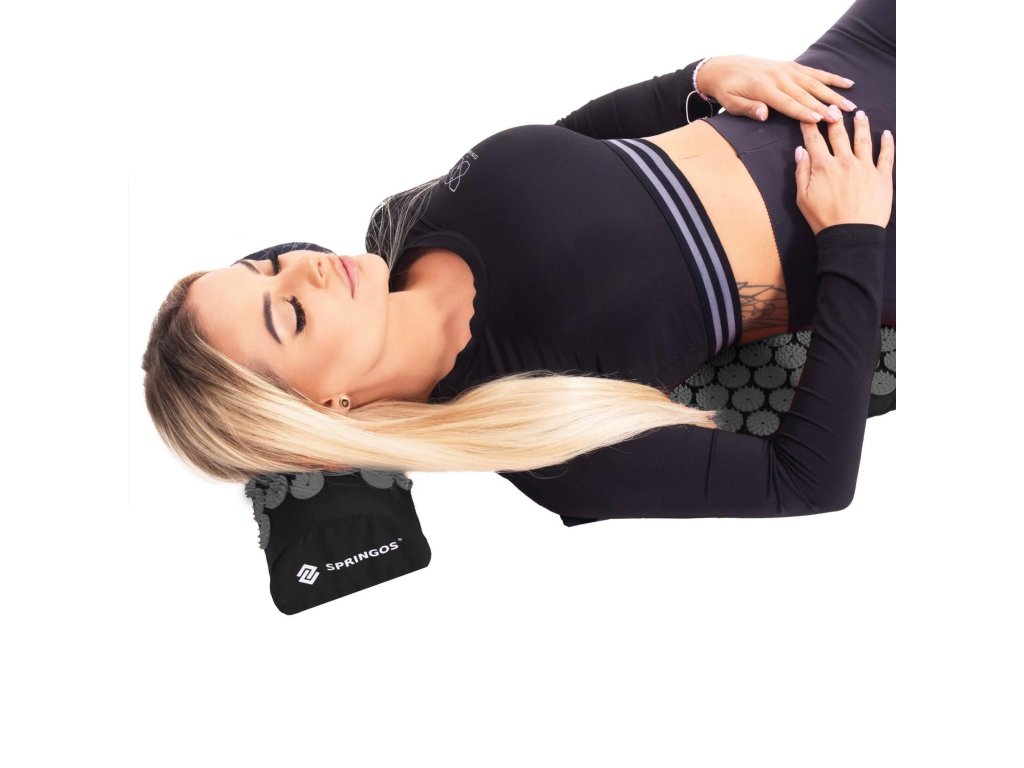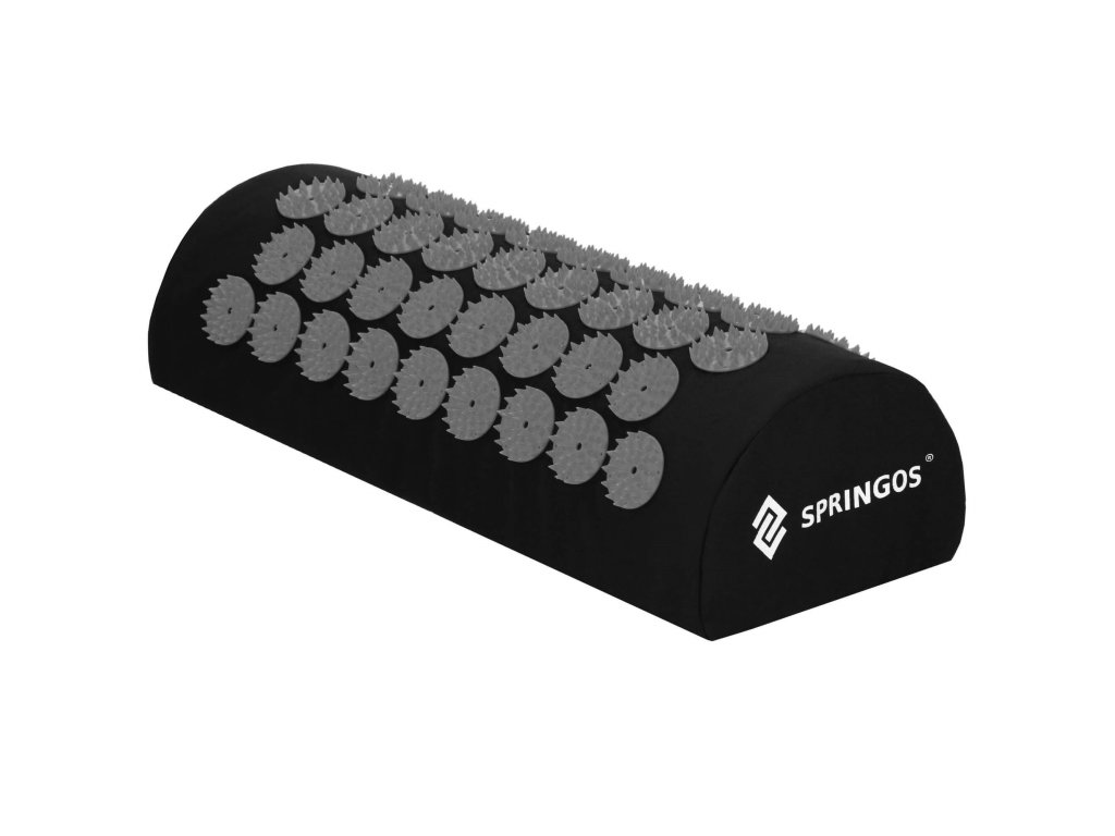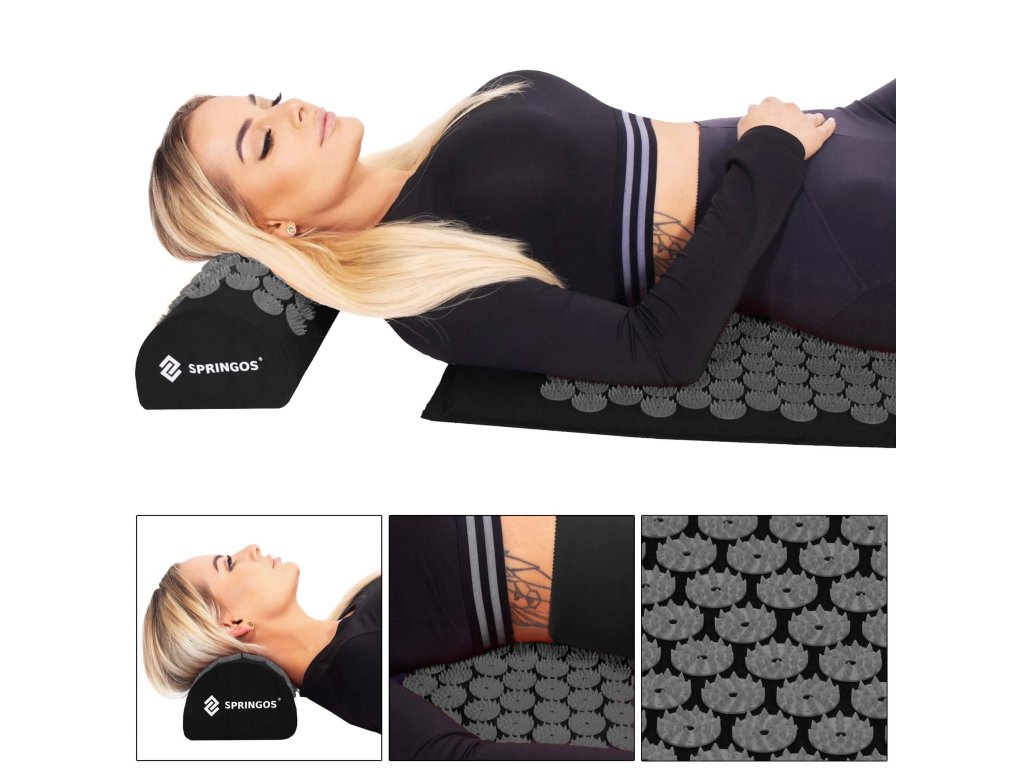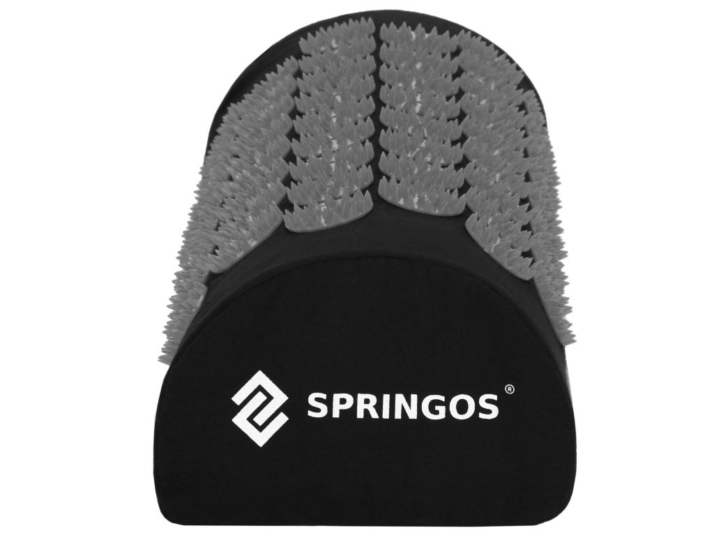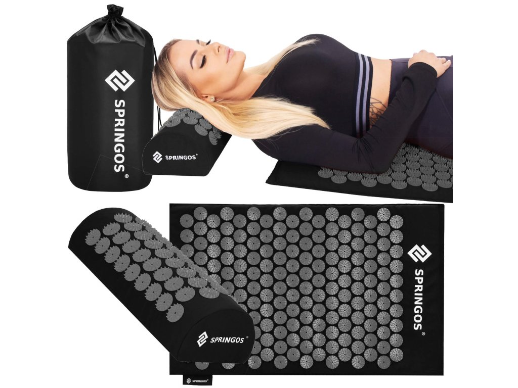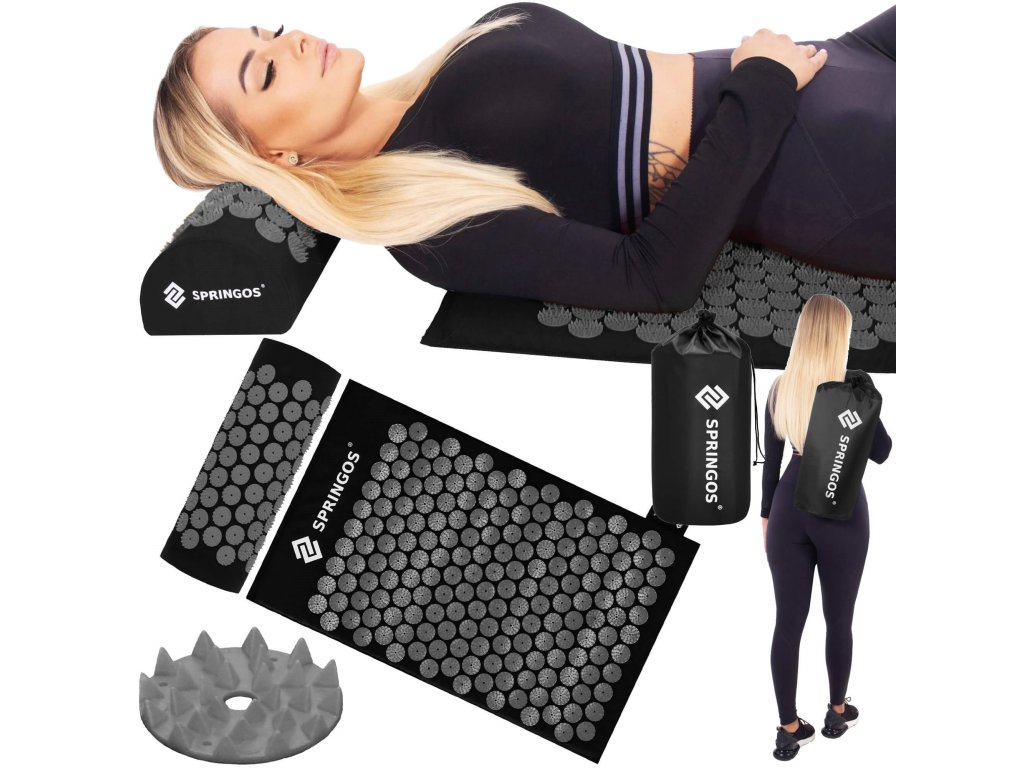 - Bombažne prevleke za podlogo in blazino so narejene iz materiala v črni barvi, našiti diski s konicami v črni barvi. Na prevlekah je tiskani bel logotip Springos, + na podlogi prišita bočna oznaka z logotipom.
