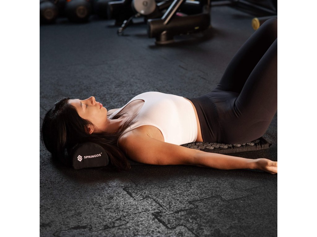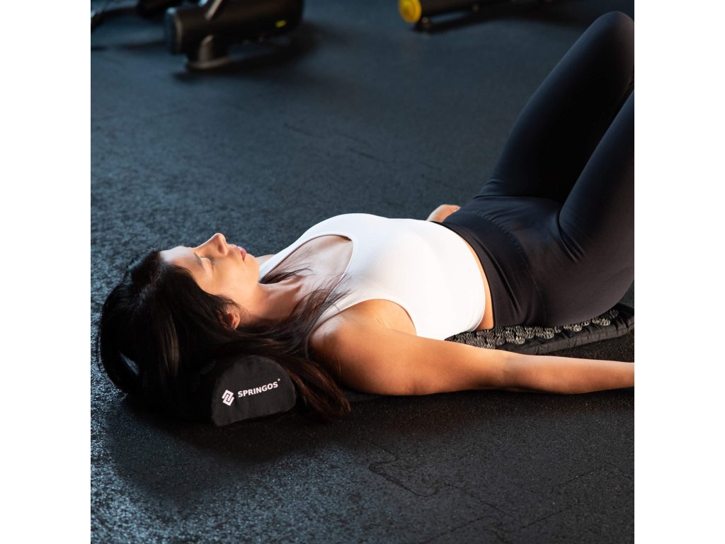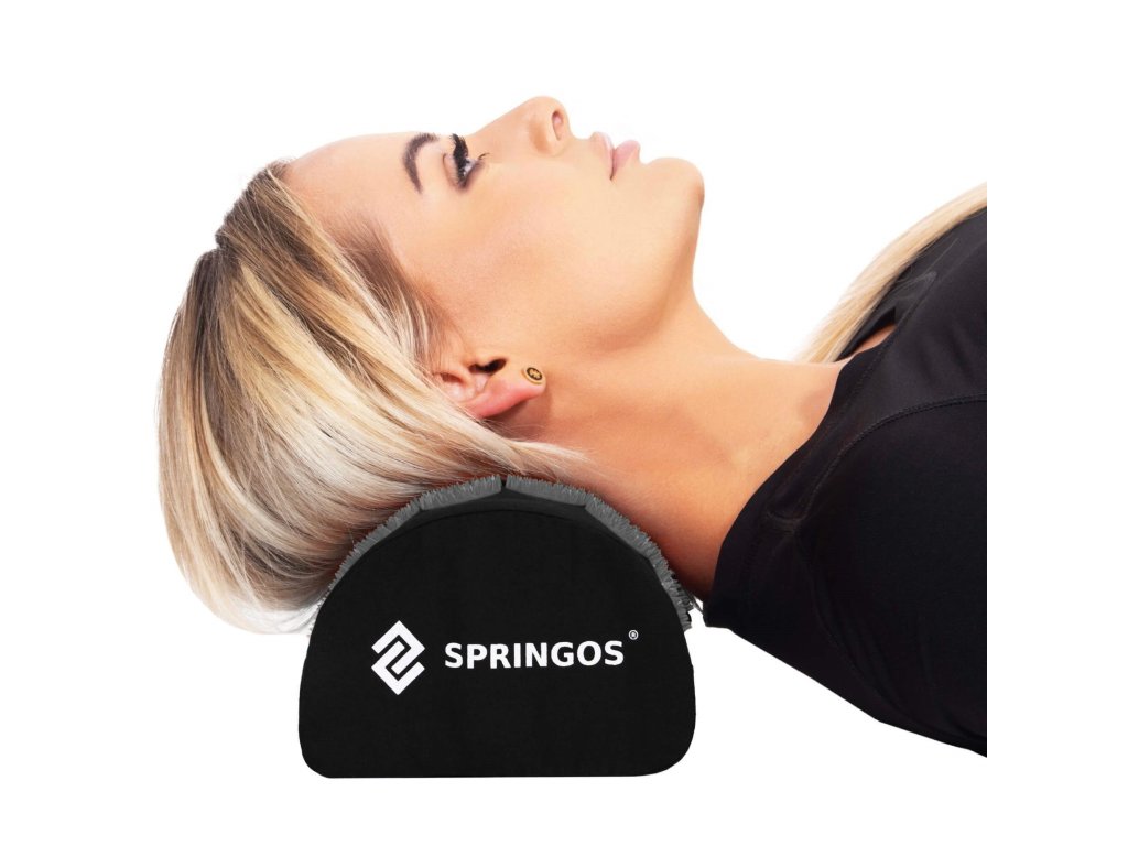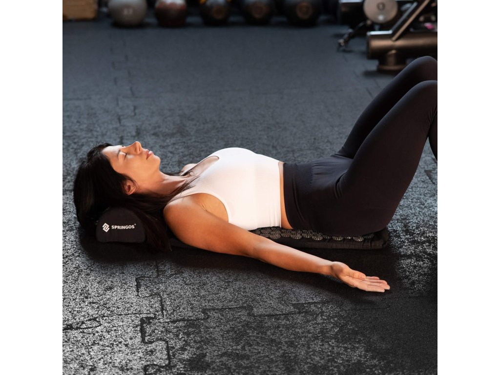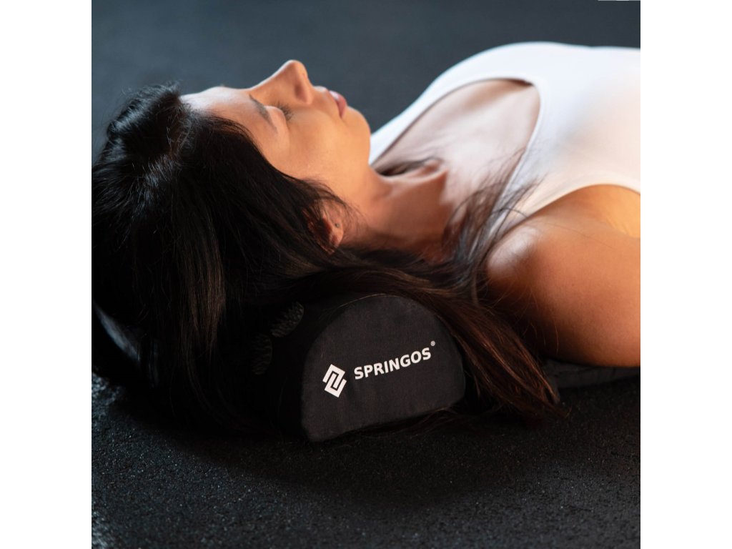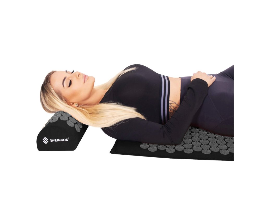 - Bombažne prevleke za podlogo in blazino so narejene iz materiala v črni barvi, našiti diski s konicami v črni barvi. Na prevlekah je tiskani bel logotip Springos, + na podlogi prišita bočna oznaka z logotipom.
