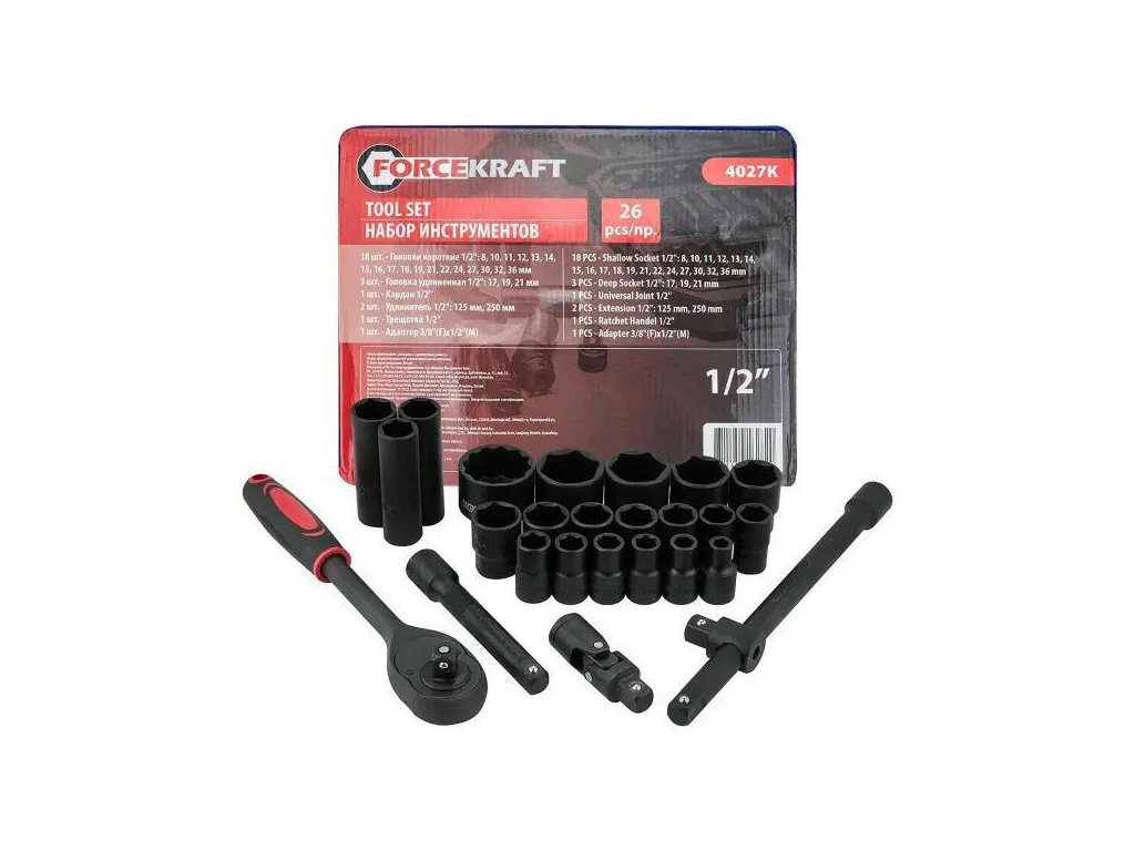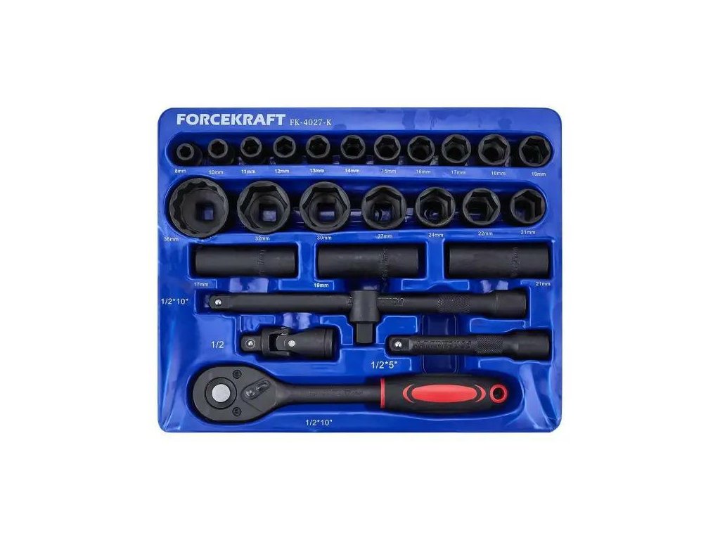 Forcekraft FK-4027-K je kompleten komplet 26 elementov s prenosom 1/2", zasnovan za delo v pogojih, ki zahtevajo najvišjo trdnost. Narejen iz visoko kvalitetnega krom-molibdenovega jekla (Cr-Mo), zagotavlja odpornost proti mehanskim poškodbam in dolgo življenjsko dobo tudi pri intenzivni uporabi v avtomobilskih delavnicah, servisih strojev ali industriji.