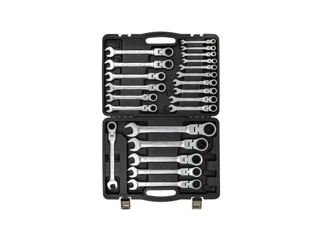 Komplet vsebuje do 22 ključev s kljunom in obročem v razponu od 6 do 32 mm, kar omogoča udobno izvajanje večine mehanskih in servisnih nalog – od manjših domačih popravkov, do del pri tehničnih inštalacijah, ter do profesionalne avtomobilske ali industrijske servisne aktivnosti.