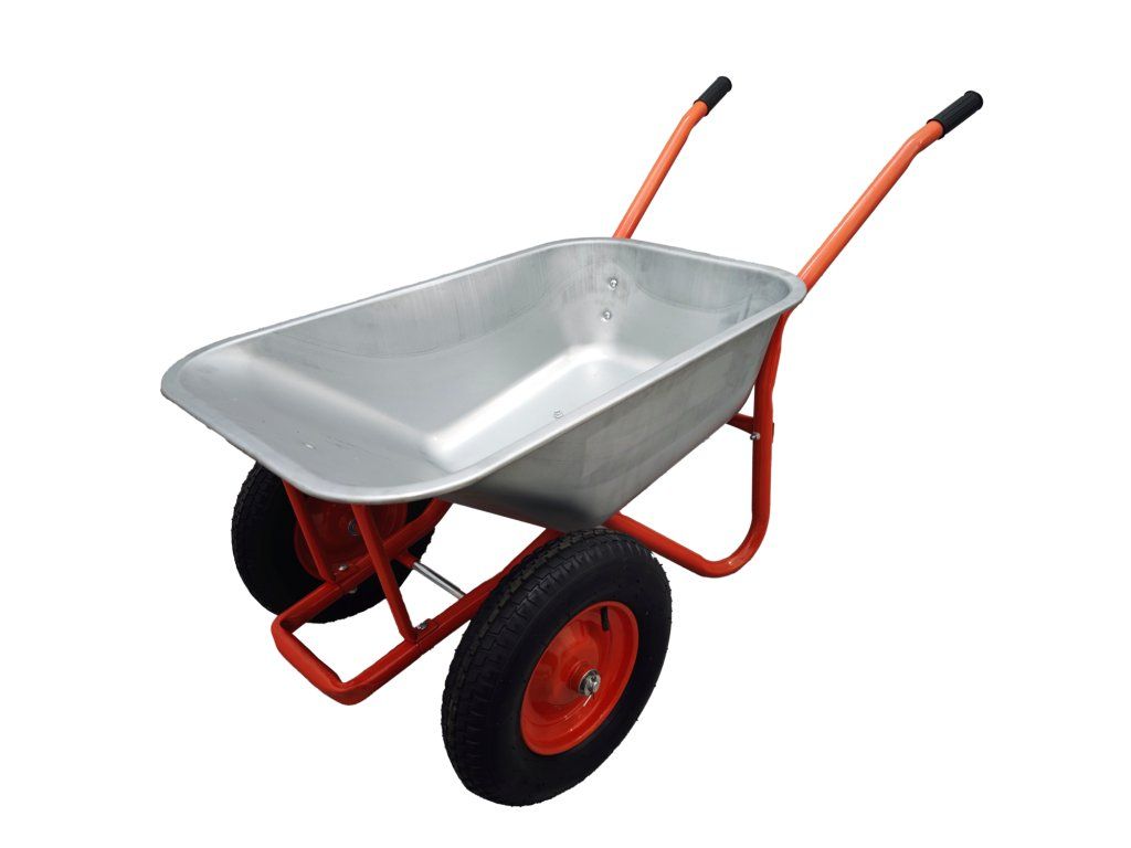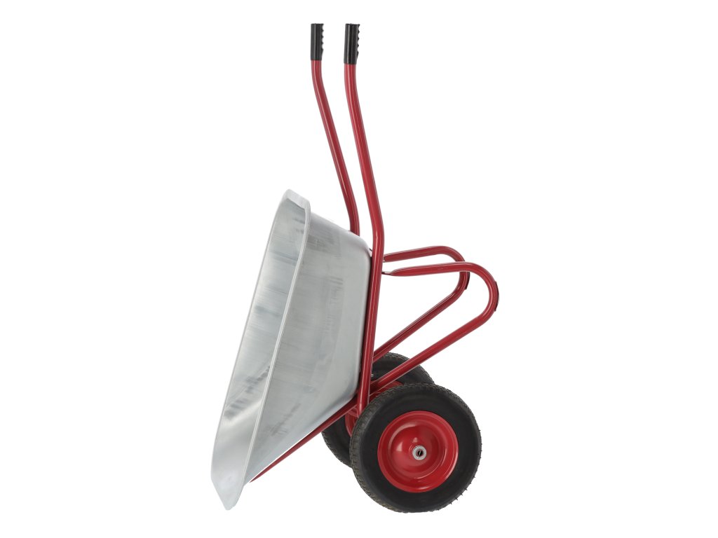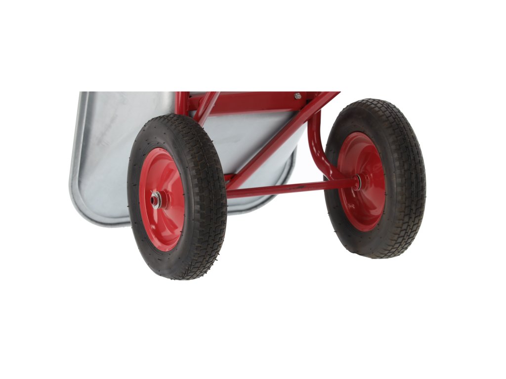 Odporn vrtalni voz, idealen za delo v vrtu in na gradbišču. Izdelan iz visokokakovostnih materialov, opremljen z jekleno cinkano posodo, lakiranim okvirom, velikimi gumijastimi kolesi z kovinskim obročem in protidrsljivimi gumijastimi ročaji za varno delo.