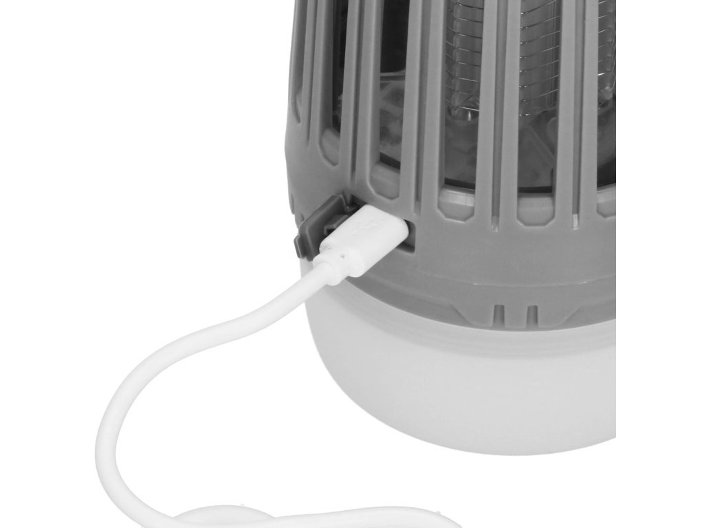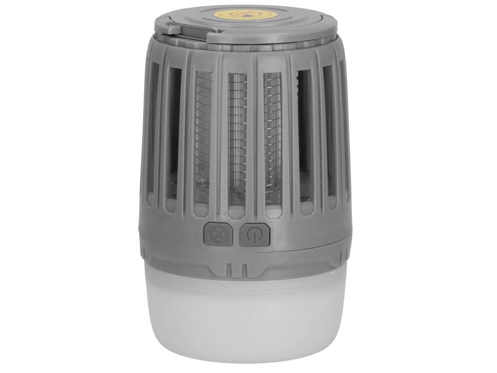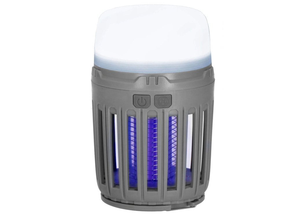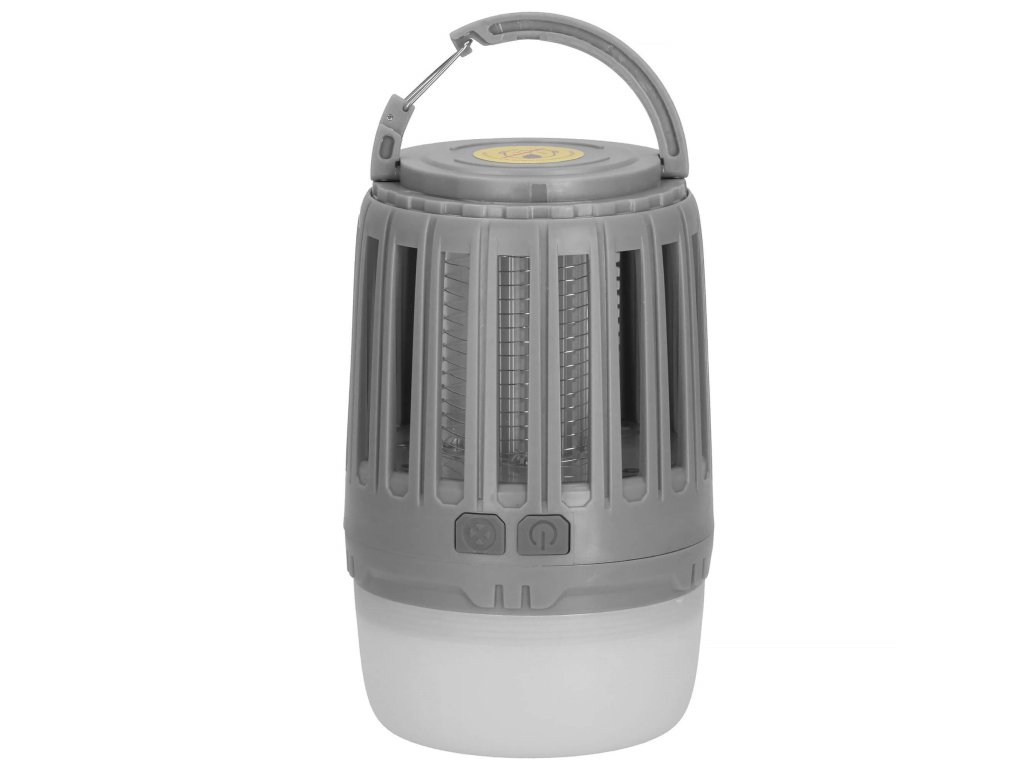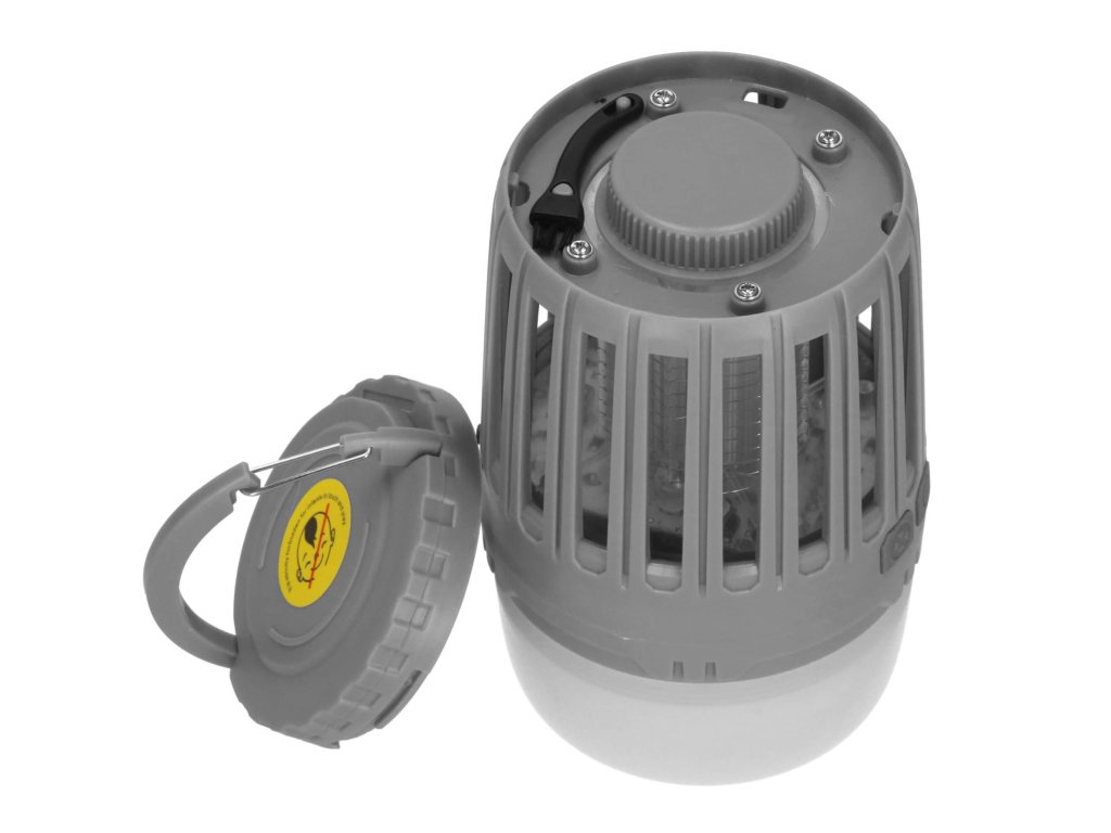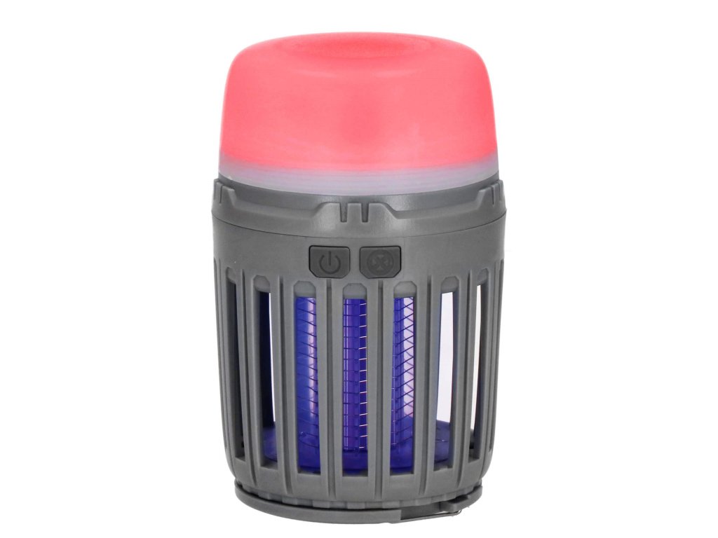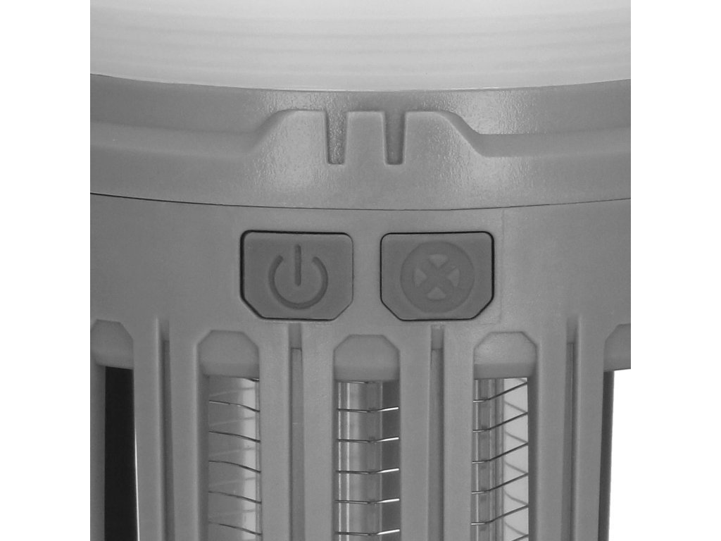 - 2 neodvisni funkciji, ki se sprožata z ločenima gumboma za vklop/izklop: 1) vijolična svetloba za privabljanje insektov in 2) bela osvetlitev/rdeča signalna luč - spodnji del svetilke