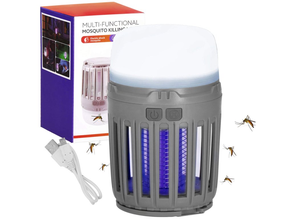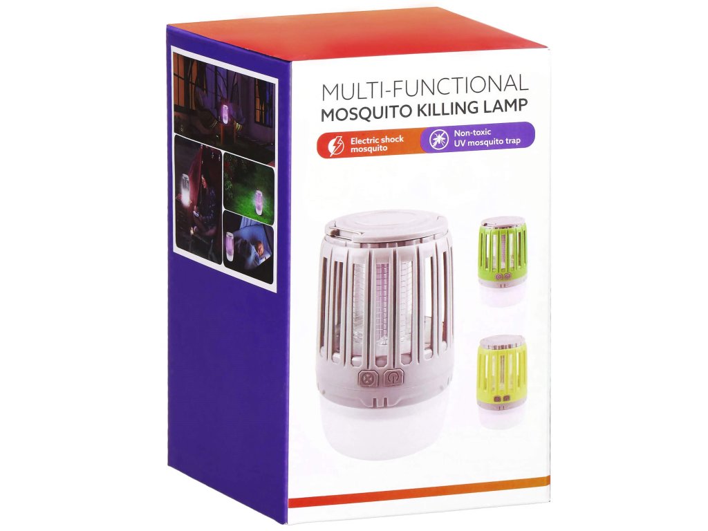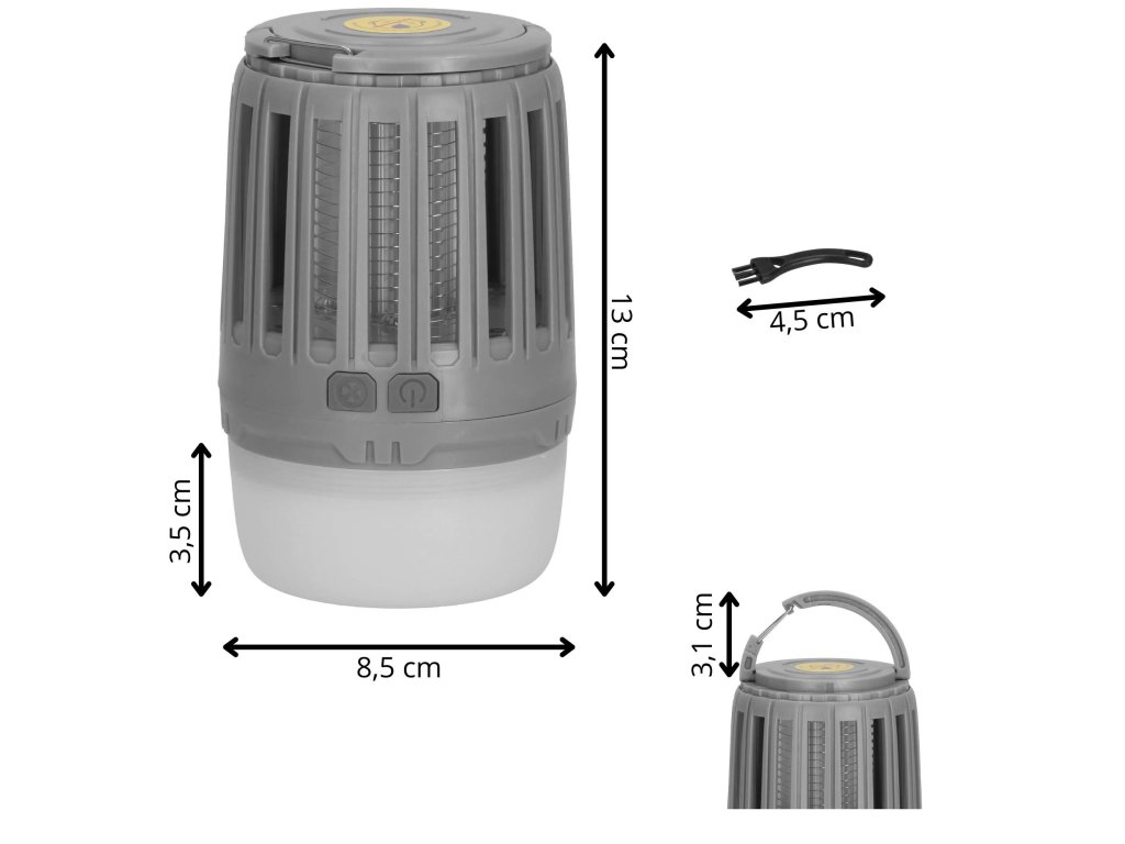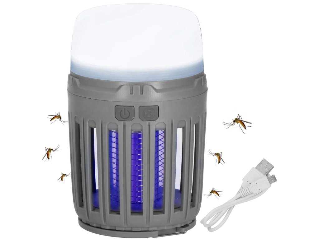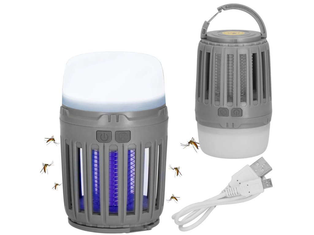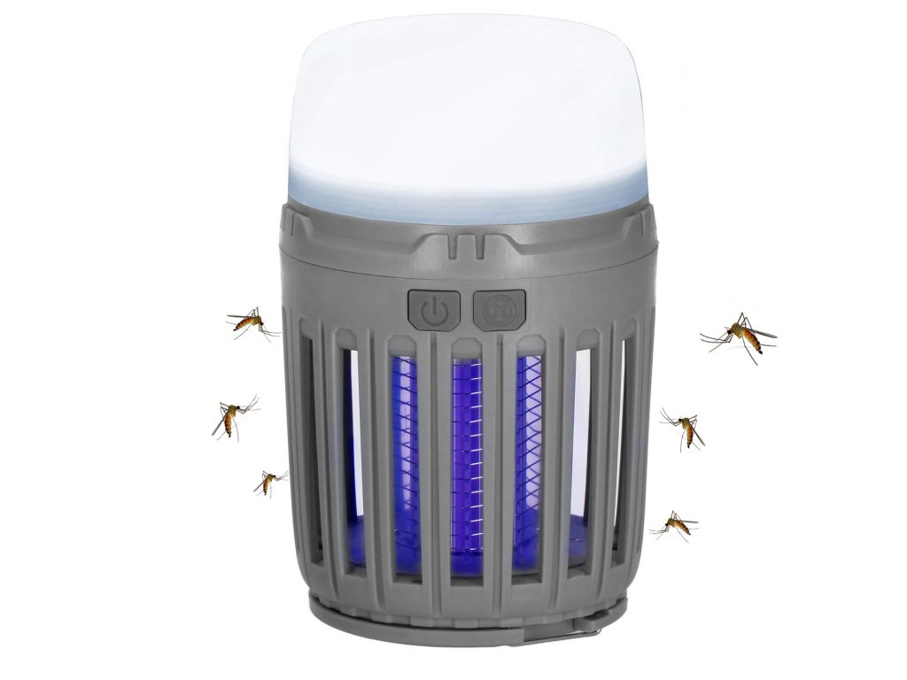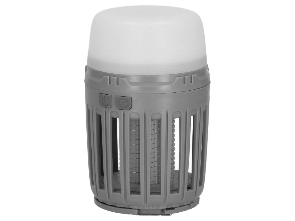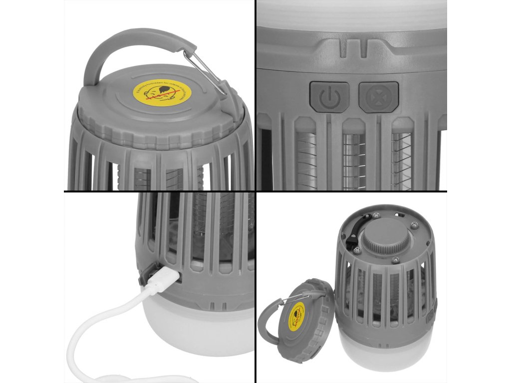 - 2 neodvisni funkciji, ki se sprožata z ločenima gumboma za vklop/izklop: 1) vijolična svetloba za privabljanje insektov in 2) bela osvetlitev/rdeča signalna luč - spodnji del svetilke
