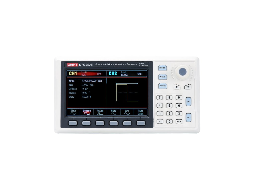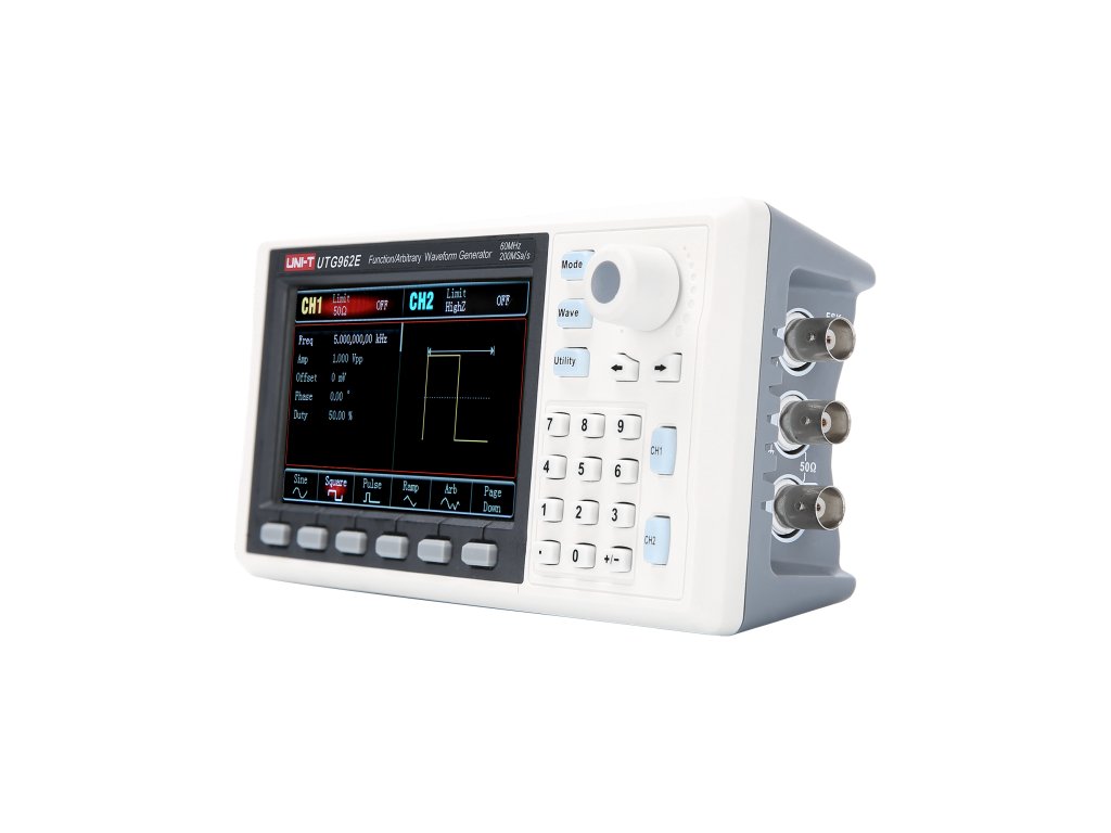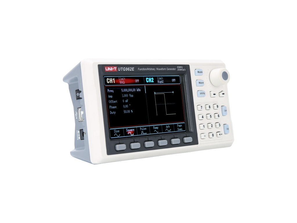Uni-T UTG962E podpira različne tipe signalov, vključno s sinusoido, kvadratnimi, impulsnimi, rampnimi in arbitrarnimi signali. Naprava omogoča generiranje sinusoide v razponu od 1 µHz do 60 MHz ter kvadratnih in impulznih signalov do 20 MHz. Možnost generiranja arbitrarnych signalov do 10 MHz omogoča natančno simulacijo signalov poljubne oblike, kar je ključno v zapletenih testnih aplikacijah.