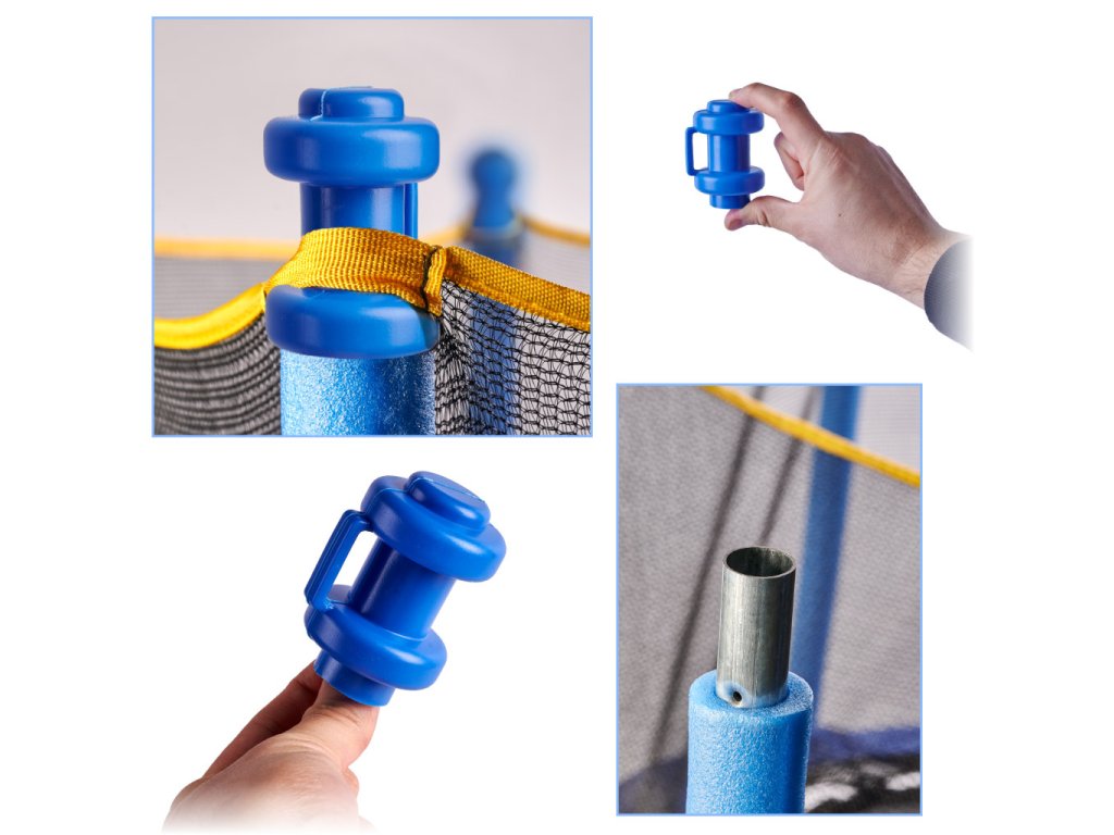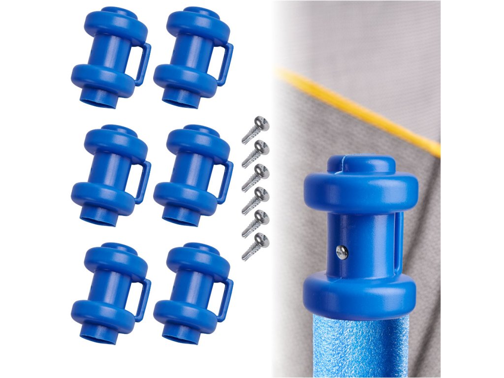 Set 6 pokrovčkov za trampolinske paliceza lažjo montažo zaščitne mreže. Imajo posebne nosilce, na katere se močno pritrdi mreža z zateznimi trakovi. Notranji premer je 25 mm, zato so združljivimi z večino trampolinov na trgu.