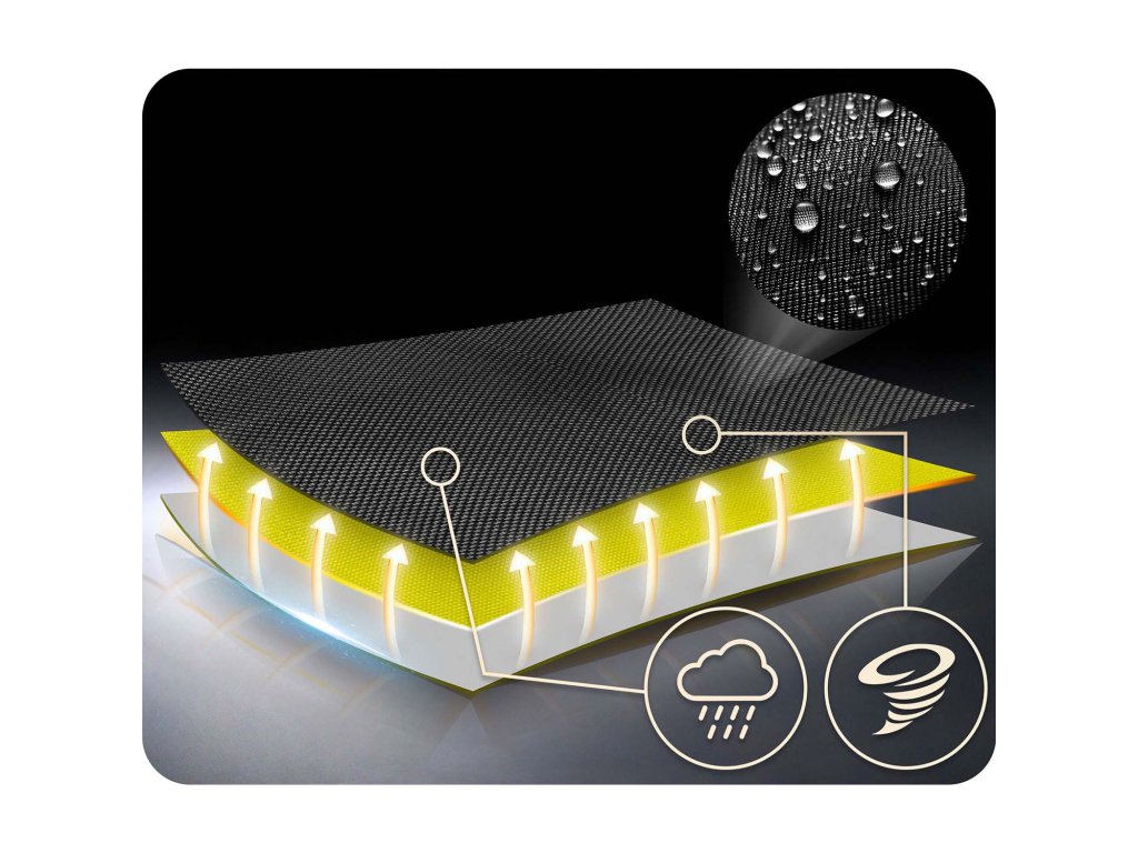 Poliester Oxford 600D, iz katerega je sedež narejen, je vodoodporen in enostavno čistljiv.