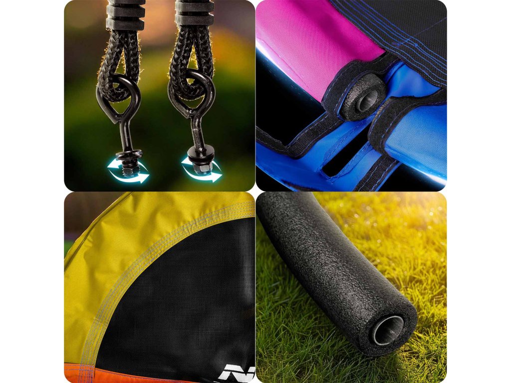 Gugalnica na jeklenem okvirju prekrita z mehko zaščitno peno, iz močnega materiala z več šivi in na debelih visečih vrveh. Zagotavlja varnost, stabilnost in vzdržljivost.