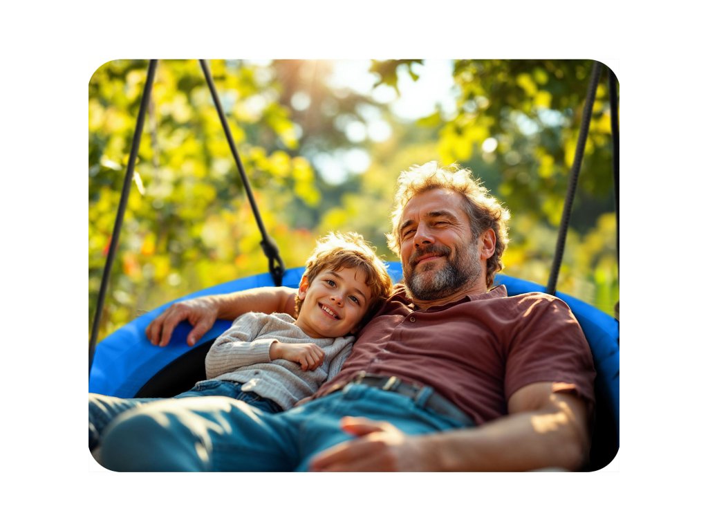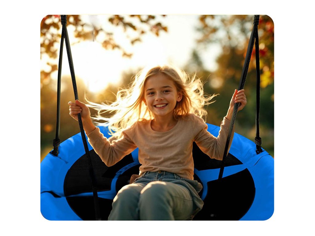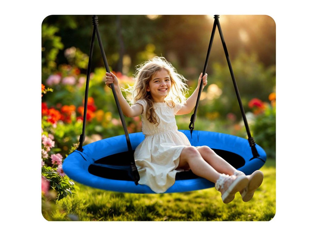Gugalnica na jeklenem okvirju prekritem z mehko zaščitno peno, iz trpežnega materiala z več šivi in na debelih visečih vrveh. Zagotavlja varnost, stabilnost in trajnost.