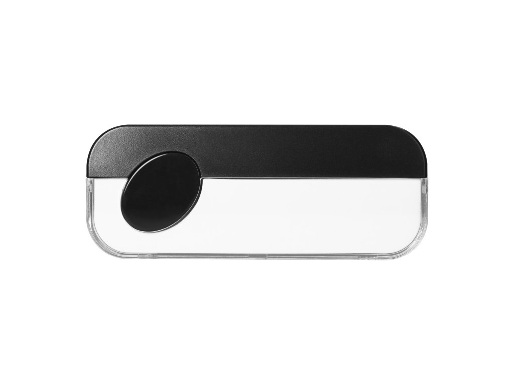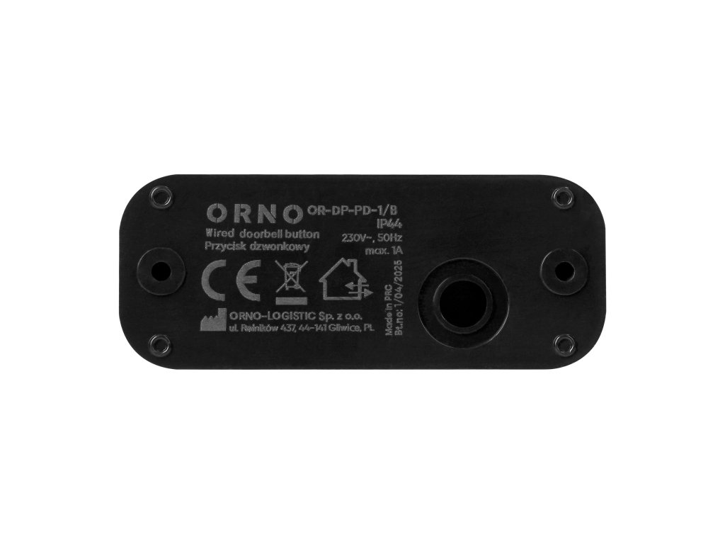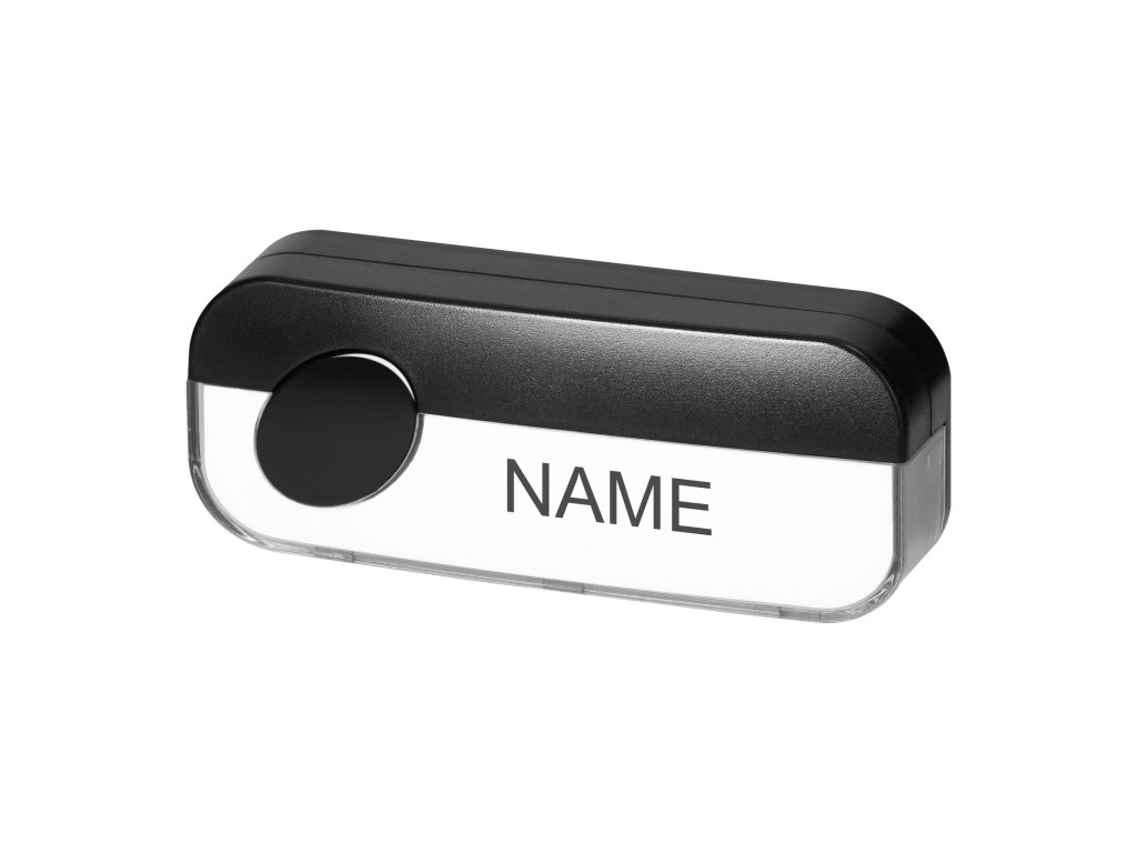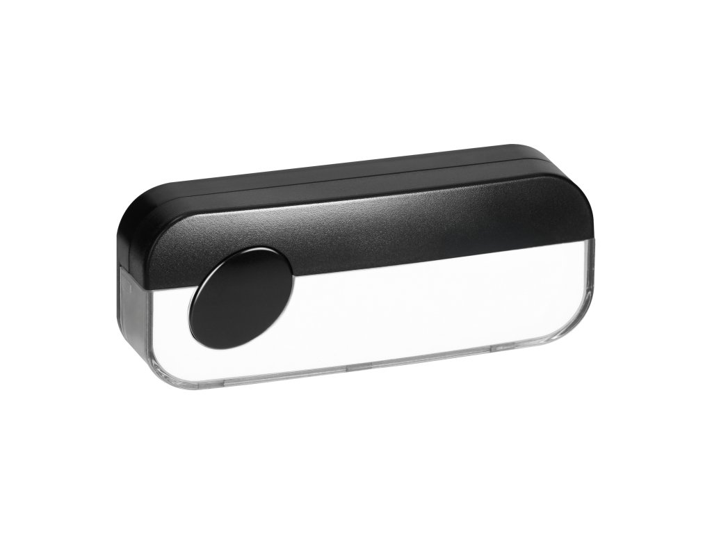 Površinsko montiran gumb za zvonec z mestom za ime. Ohišje iz plastike. Namenjen za ožičeno namestitev zvonca. Zaščitni razred IP44 zagotavlja zaščito pred dežjem in zanesljivo delovanje v različnih vremenskih pogojih.Dimenzije 81x33x18mm. Črna barva.
