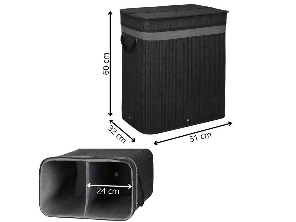 - Elementi v kompletu (6 kosov): bambusovo ogrodje, dno iz MDF, zgornja ojačitev iz kovinske žice, notranjost iz tkanine, bambusov pokrov - 2 dela