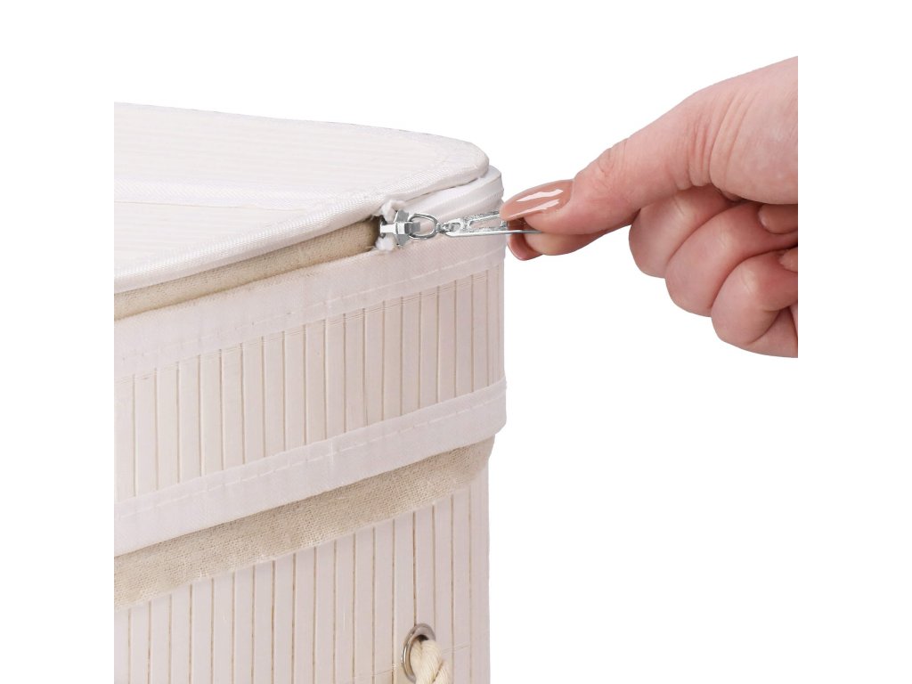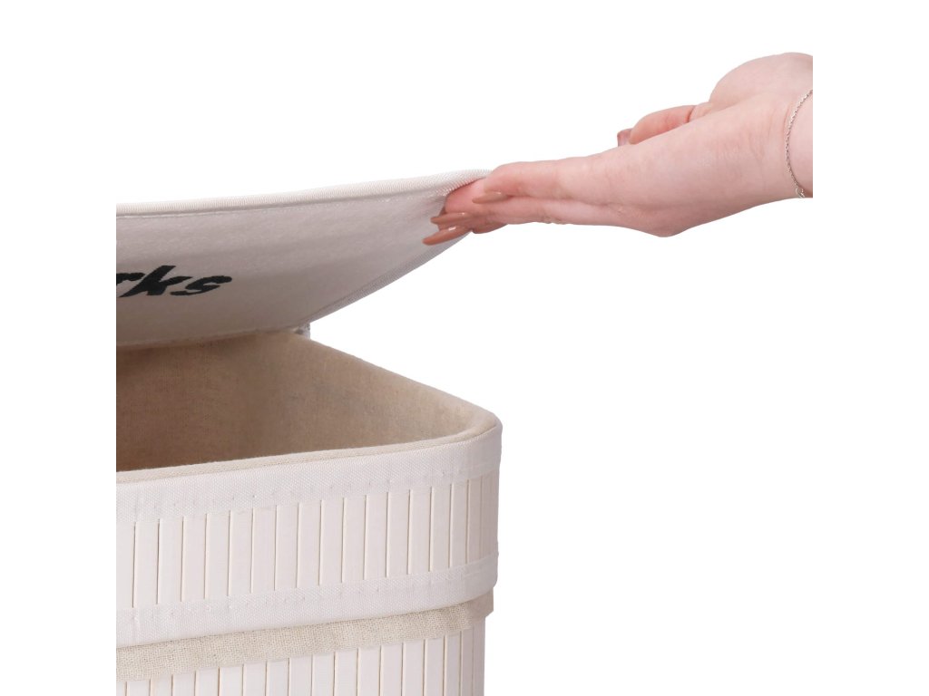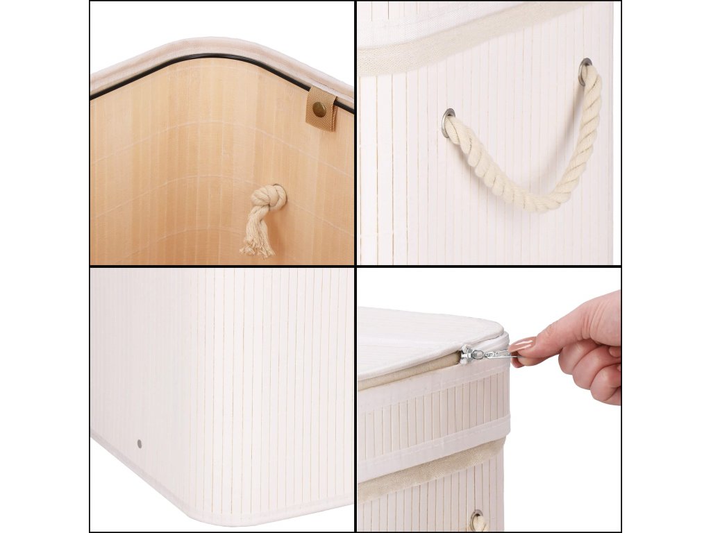 - Elementi v kompletu (6 elementov): bambusno jedro, dno iz MDF, ojačitev zgornjega elementa iz kovinske žice, notranjost iz tkanine, bambusov pokrov - 2 elementa