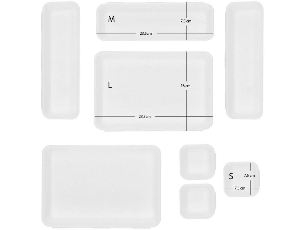 - 3x organizator v velikosti S: 7,5x7,5x4,5 cm