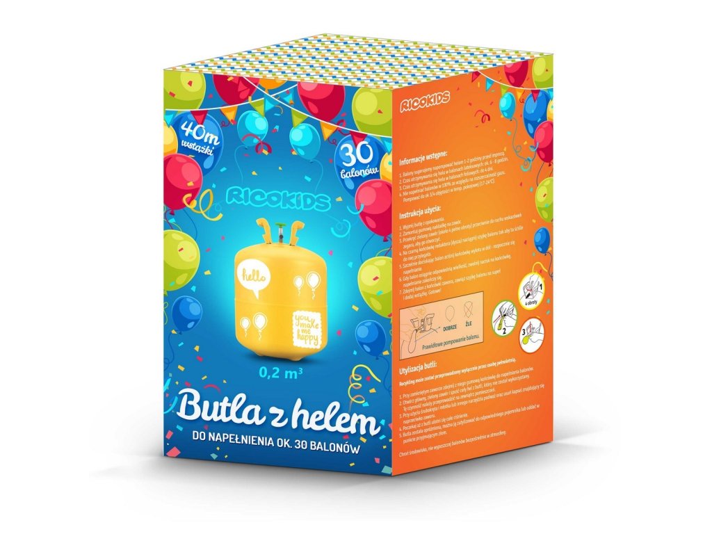 Steklenka zadostuje za napolnitev približno 30 balonov s premerom približno 23 cm.