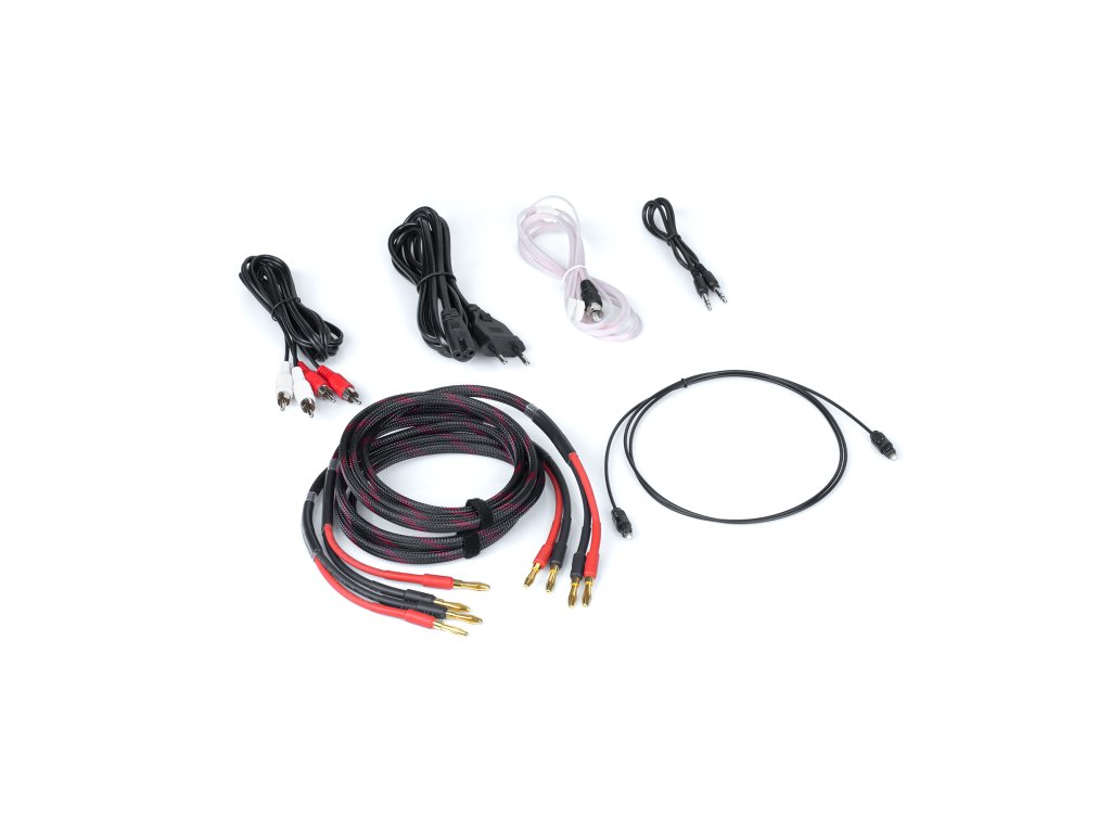 Vsebina paketa: napajalni kabel, optični kabel, RCA kabel, kabel za zvočnike, radijska antena, daljinski upravljalnik.