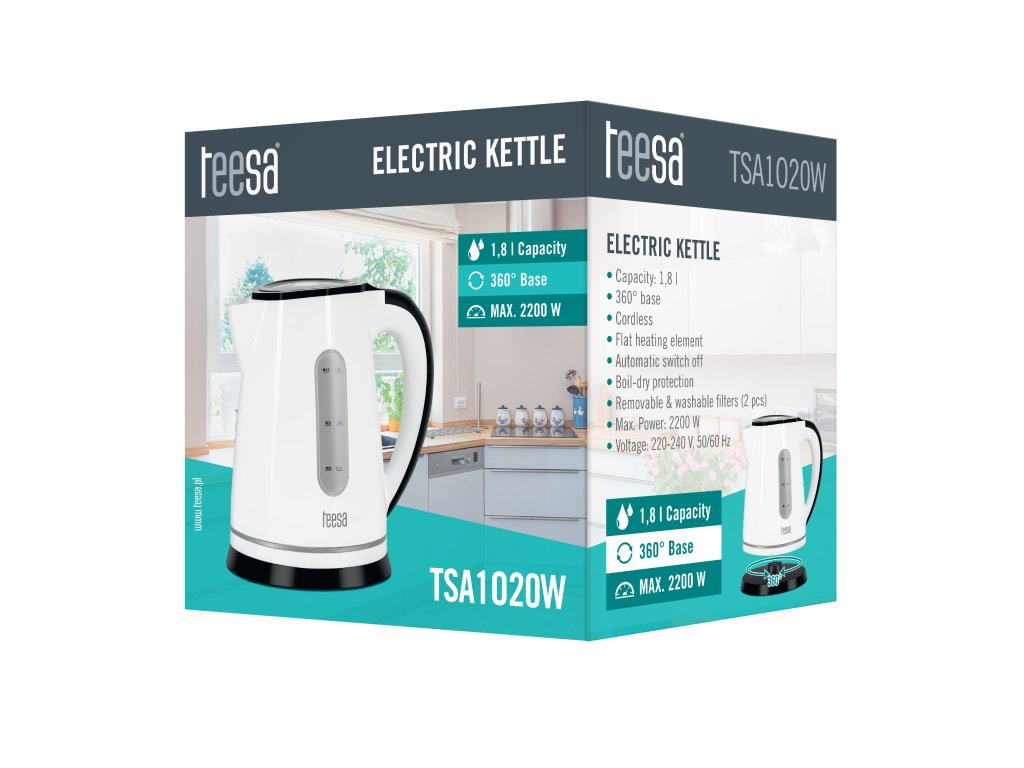 Visokokakovostna plastika, iz katere je izdelan čajnik Teesa s simbolom TSA1020 in na voljo v barvi beli ali črni, omogoča, da se naprava lepo vklopi v skoraj vsak kuhinjski dekor. Velika kapaciteta – 1,8 l in največja moč 2200W omogočata hitro vrenje velike količine vode, zelo tih grelni element pa zagotavlja skoraj neslišno delovanje.