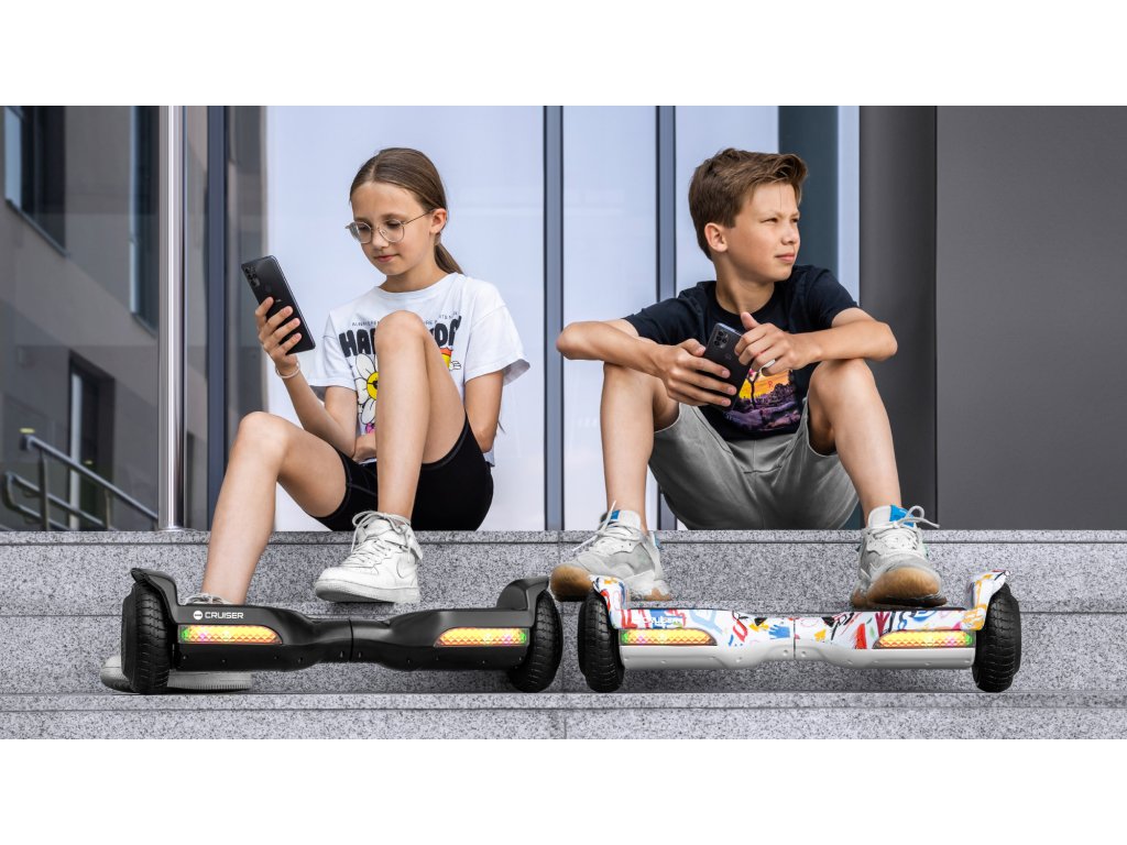 Preizkusite električni skateboard Cruiser Paint in odkrijte, kako udobno in razburljivo je lahko raziskovanje mesta ali dolgi sprehod na dveh kolesih. Pustite se presenetiti, kako enostavno se lahko premikate z enega mesta na drugo! Potrebujete le minimalno ravnotežje telesa - položaj telesa in gibanje nog določata smer vožnje in hitrost.
