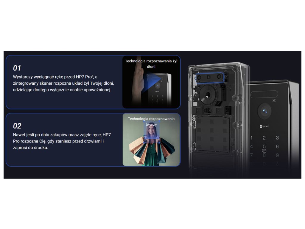 Komplet HP7PRO EZVIZ je opremljen s kamero z ultra-visoko ločljivostjo 4K in ponuja kar 7 metod avtentikacije vstopa, vključno z biometričnim odklepanjem s roko ali obrazom. Dodatno, zahvaljujoč uporabi programske opreme Home Play OS, lahko videodomofon služi kot osrednja točka za upravljanje pametne hiše.