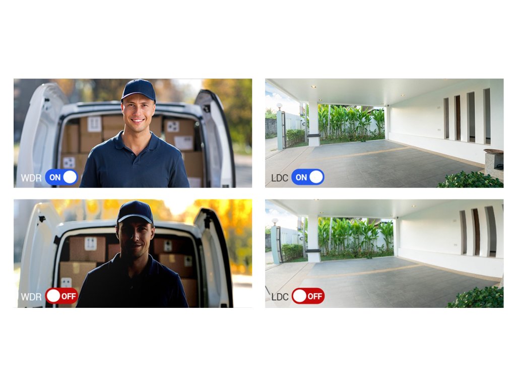 Funkcija WDR (Wide Dynamic Range) samodejno uravnava razlike v svetlosti med temnimi in svetlimi področji slike – zaradi tega je vedno dobro vidna obraz osebe, ki stoji pod močno osvetljenim vstopom ali v senci. To je ključna lastnost v primeru hiš s steklenimi vrati, LED osvetlitvijo ali vstopom proti soncu.