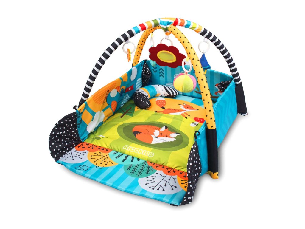- Komplet vsebuje: podlogo, 4 stranice, 2 loka, 7 večnamenskih igrač, blazino.