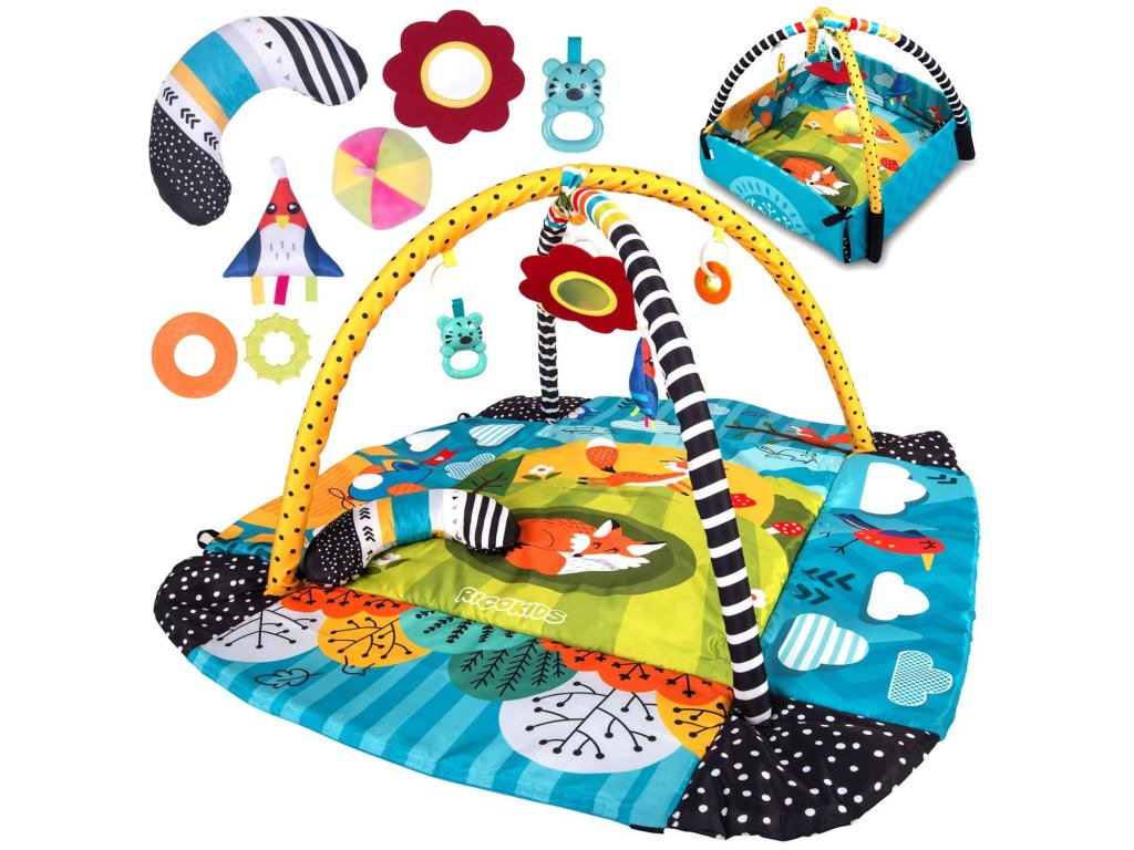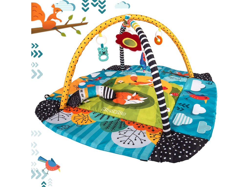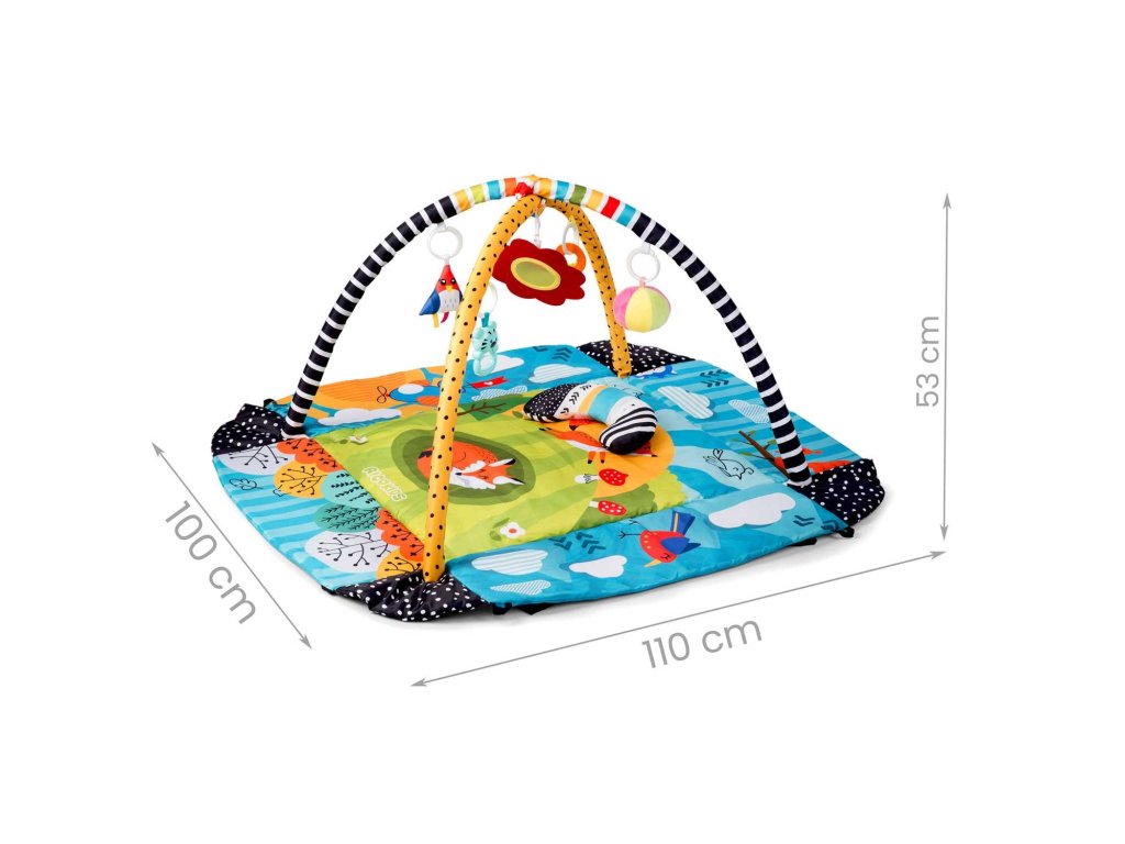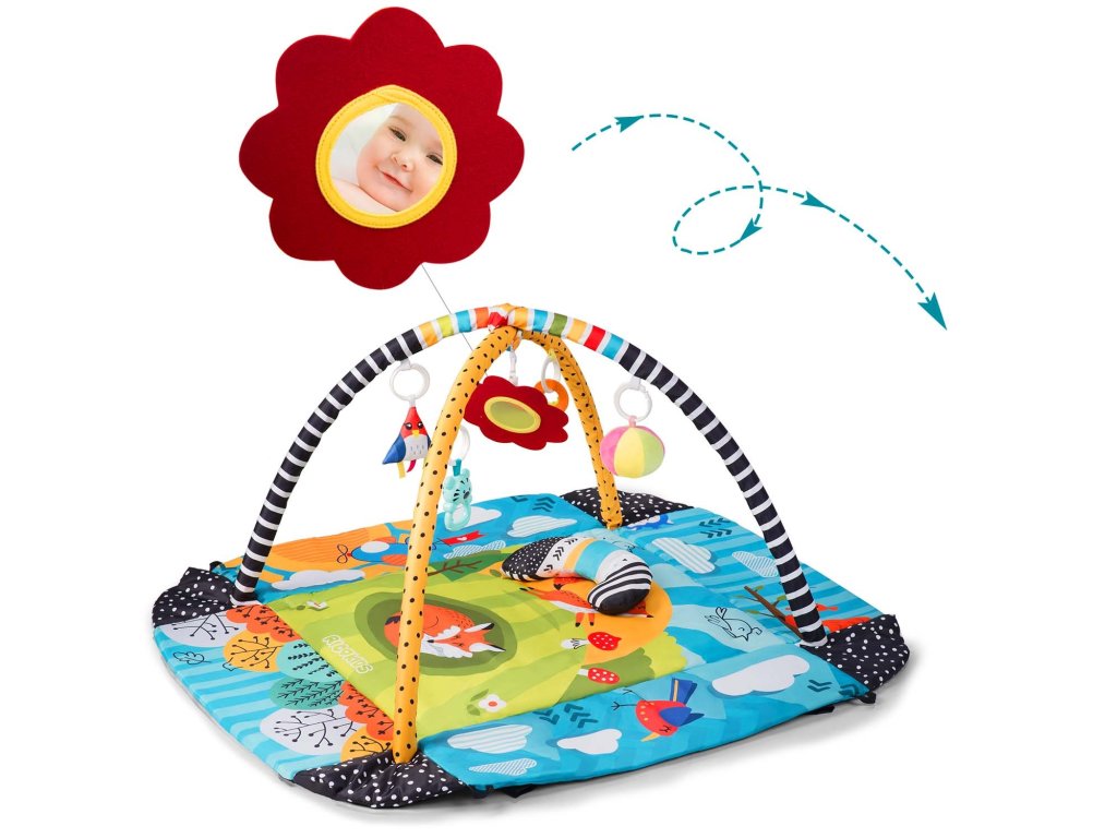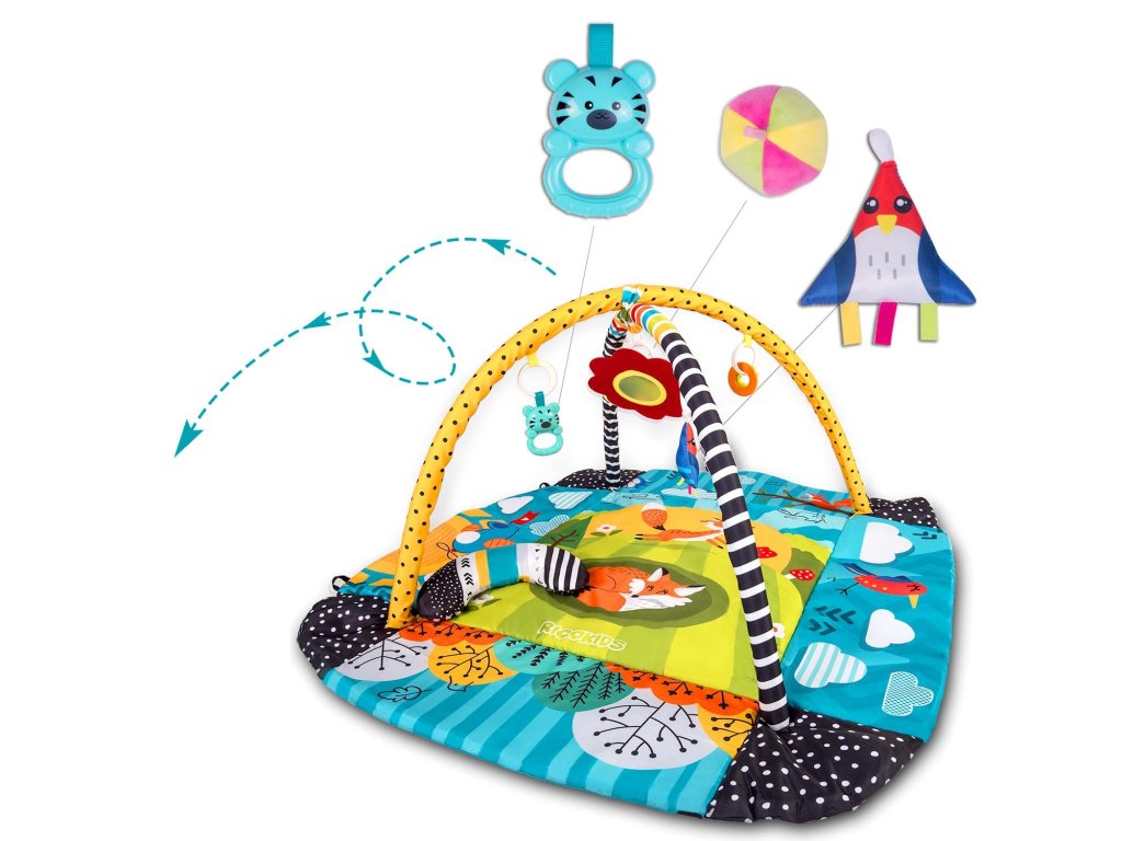 Zato je podloga izdelana iz kontrastnih, živih barv in dobavljiva z večnamenskimi igračami - tigrom z ročajem ali z žogico z zvončkom v notranjosti.