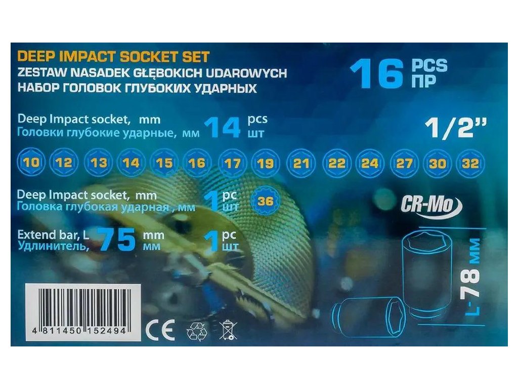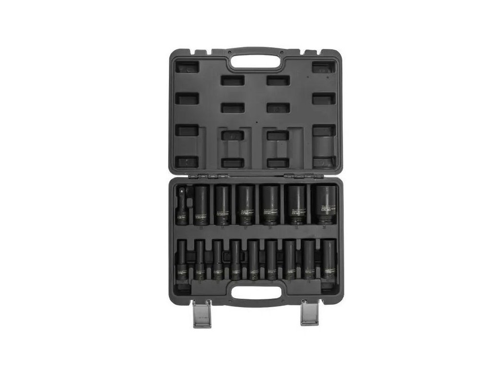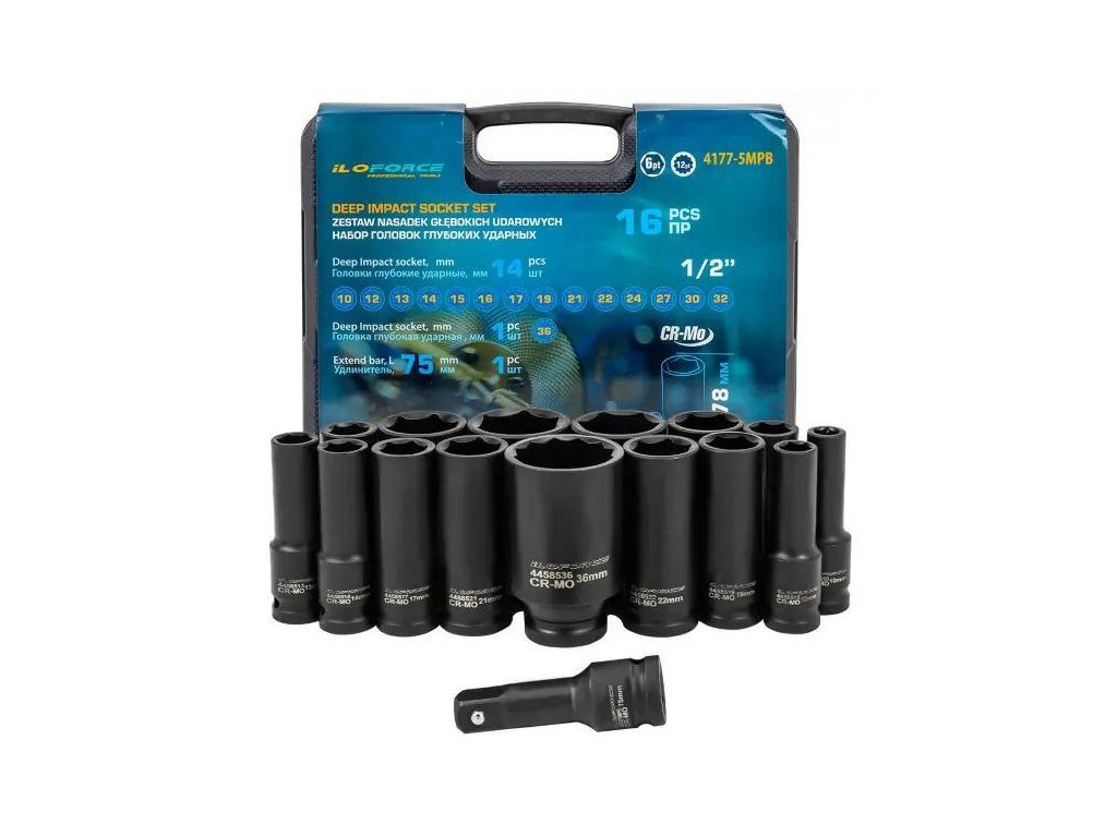 36 mmPodaljšek udarnega pripora 1/2": 75 mmTrdna, odporna transportna torbicaKomplet 16 globokih udarnih glav 1/2" je zbirka zanesljivih orodij, izdelanih iz trdnega krom-molibdensko jekla (Cr-Mo), zasnovanih za najzahtevnejše aplikacije. 6-krake glave so idealne za delo s tesnili z visokim navorom – tako v avtomehaničnih delavnicah kot v težki industriji.Zahvaljujoč veliki globini in trdni konstrukciji so glave odlične za vijake, ki so postavljeni globoko, na dolgih palicah ali na težko dostopnih mestih. Komplet vsebuje tudi podaljšek 75 mm, kar omogoča še večji doseg dela.