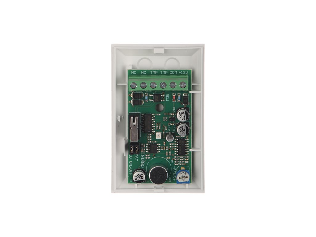 INDIGO je akustični senzor razbitja stekla, ki služi za zaščito objektov z velikim številom steklenih površin. Namenjen je detekciji razbitja stekla iz navadnega, kaljenega in laminiranega stekla. INDIGO preučuje zvočni signal dvokanalno – najprej z vidika zvoka udarca v steklo (nizka frekvenca) in nato zvoka razbitnega stekla (visoka frekvenca). Šele po detekciji obeh signalov se sproži alarm. To omogoča izključitev signalizacije nedolžnih dogodkov, kot so na primer udarci v steklo z vejami, ki se gibljejo ob vetru. Senzor je opremljen s kontinuirnim prilagajanjem občutljivosti detekcije, sabotažnim stikom in nadzorom napetosti napajanja.