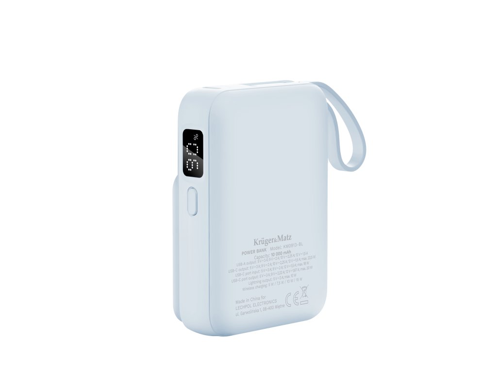 Zaradi različnih priključkov, kot so USB-A, USB-C in Lightning, je Kruger&Matz KM0913 združljiv s številnimi napravami - od pametnih telefonov in tablic do slušalk in pametnih ur. Ne glede na to, katero napravo imate, ji bo ta power bank zagotovil potreben odmerek energije.