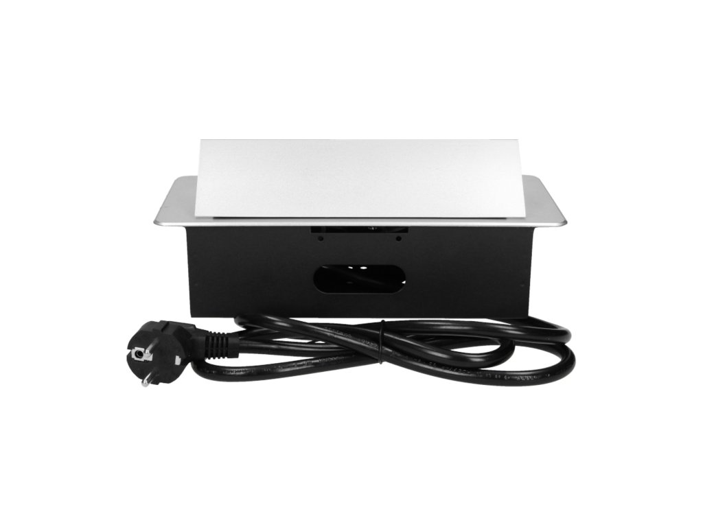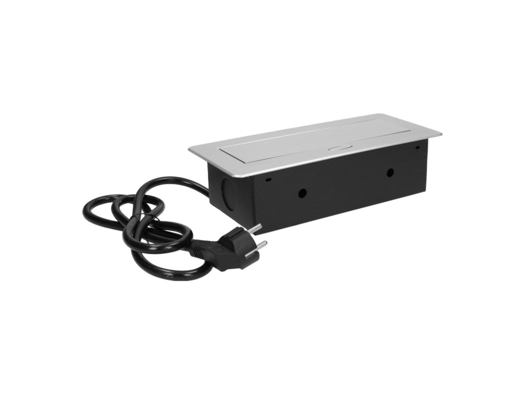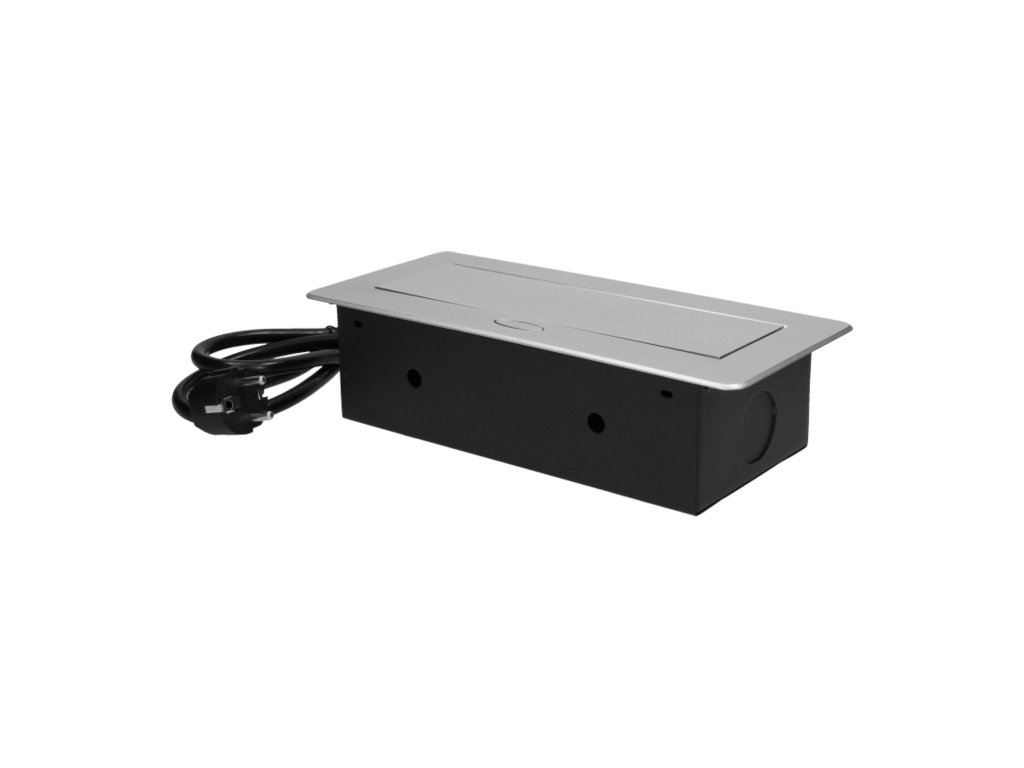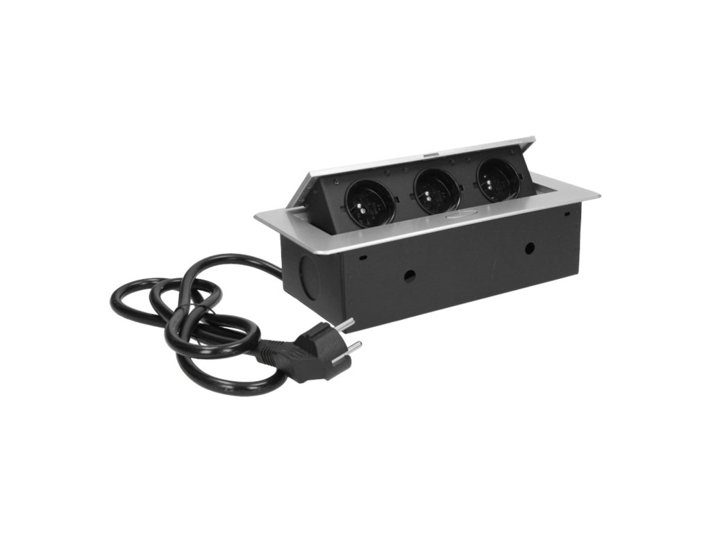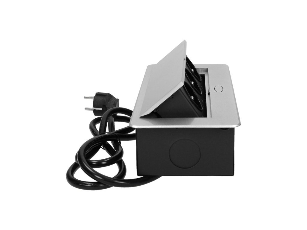 Komplet treh vtičnic z ozemljitvijo in zaščito pred napetostjo z največjo nazivno močjo 2500 W. Te vtičnice so nameščene v izvlečnem pokrovu. Naprava je namenjena za montažo v mize, delovne površine in mize. Zahvaljujoč zelo ravnemu in brušenemu robu panel izgleda elegantno na vsaki mizi in ne otežuje čiščenja. Vtičnice je mogoče montirati vertikalno in horizontalno, kar olajša priključitev dodatnih naprav na napajanje. Plošča vtičnic se zapira in odpira ob pritisku. Komplet je opremljen s 3 m dolgim kablom. Na voljo barve: črna, srebrna.Všeobecne informacije: