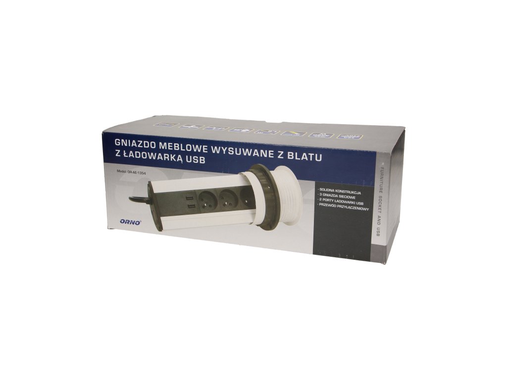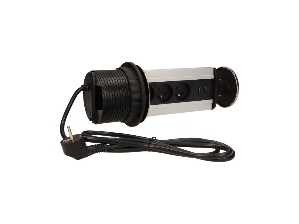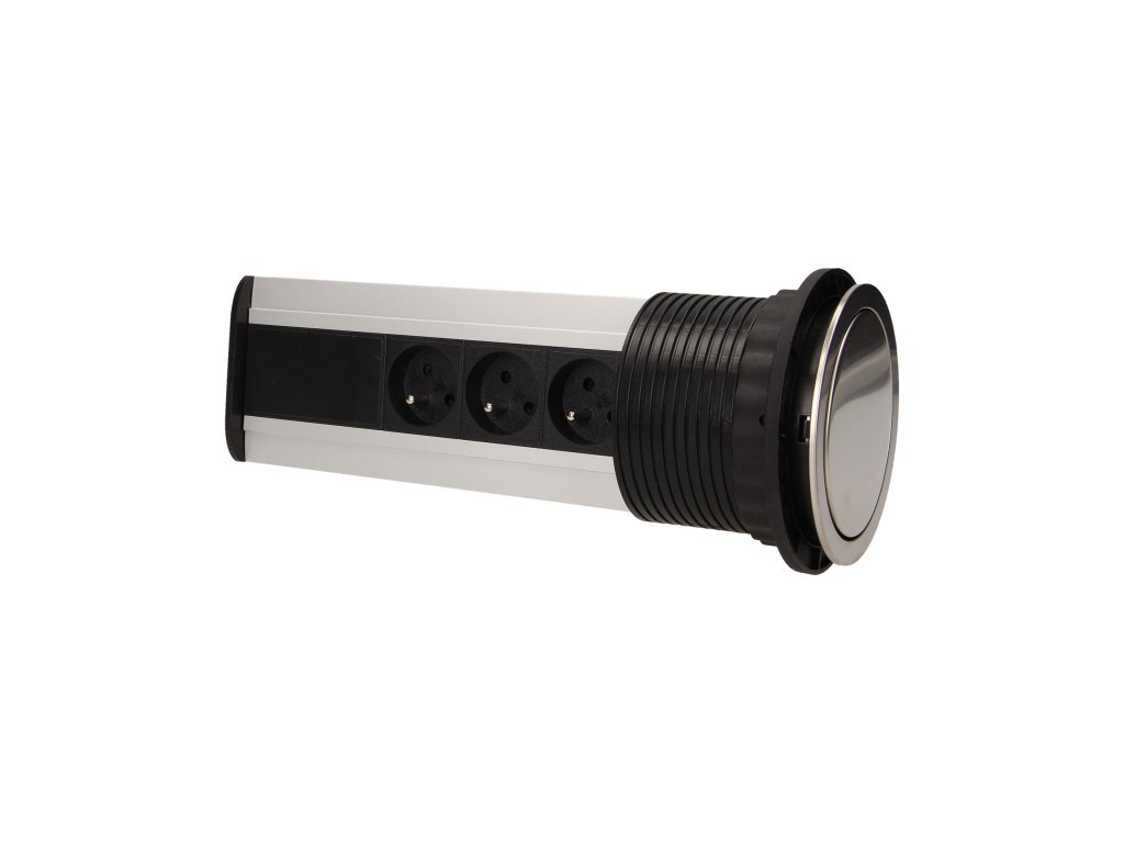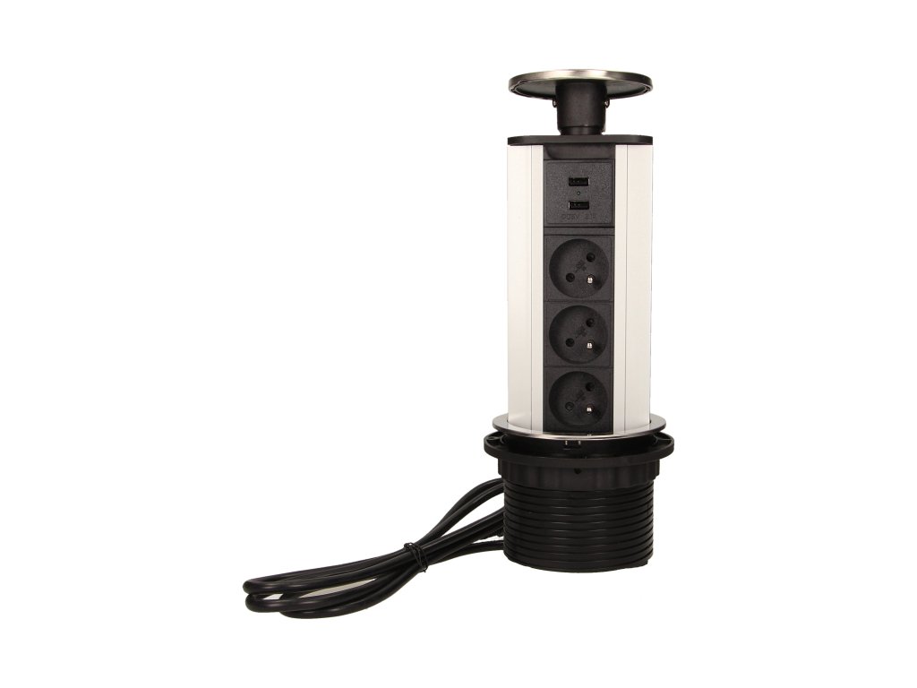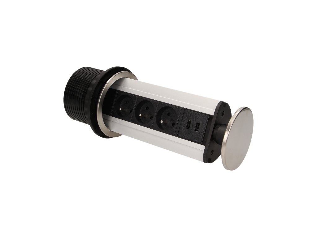 Komplet treh napajalnih vtičnic 2P+Z z vgrajenim USB polnilnikom v izvlečnem zgornjem pokrovu omogoča dostop do električnih vtičnic. Ima izvlečno ploščo z vtičnicami. Zasnovano za notranjo vgradnjo v mize, delovne plošče in pisarniško pohištvo. Za vgradnjo naprave v delovno površino je potrebna le ena luknja s premerom 10 cm.